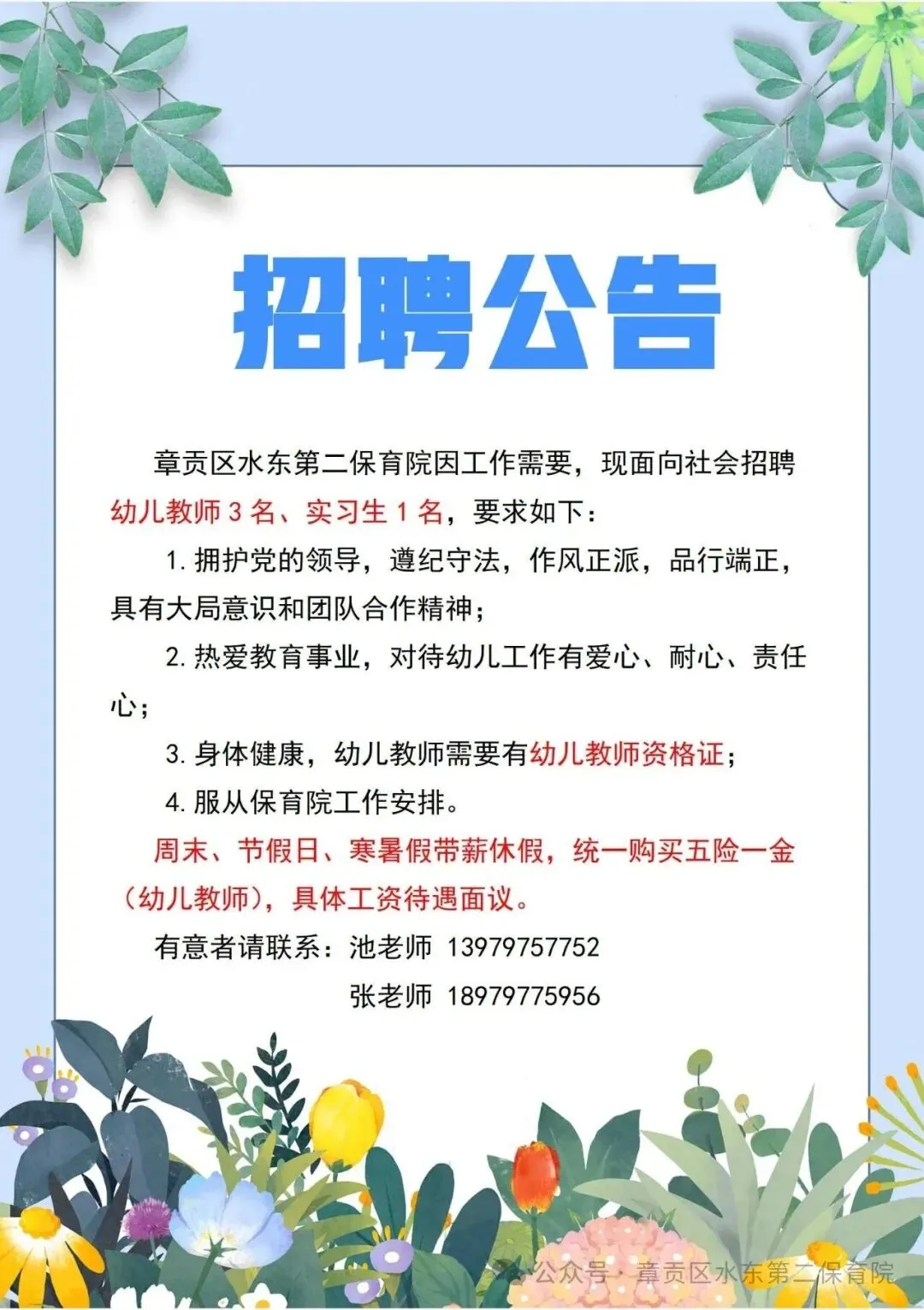赣州章贡区水东第二、三保育院2026年春季招聘公告