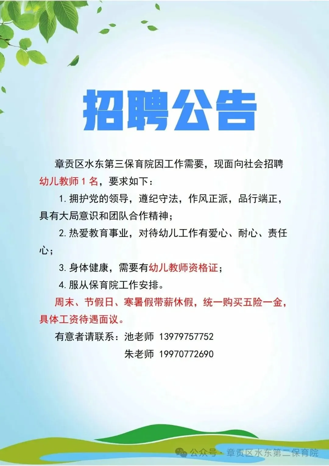 >赣州章贡区水东第二、三保育院2026年春季招聘公告