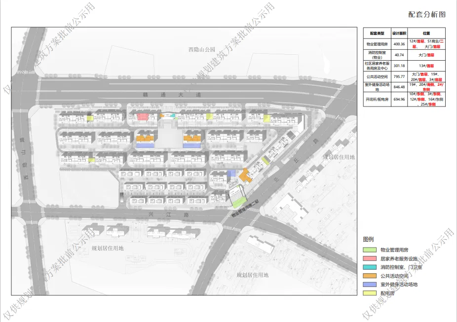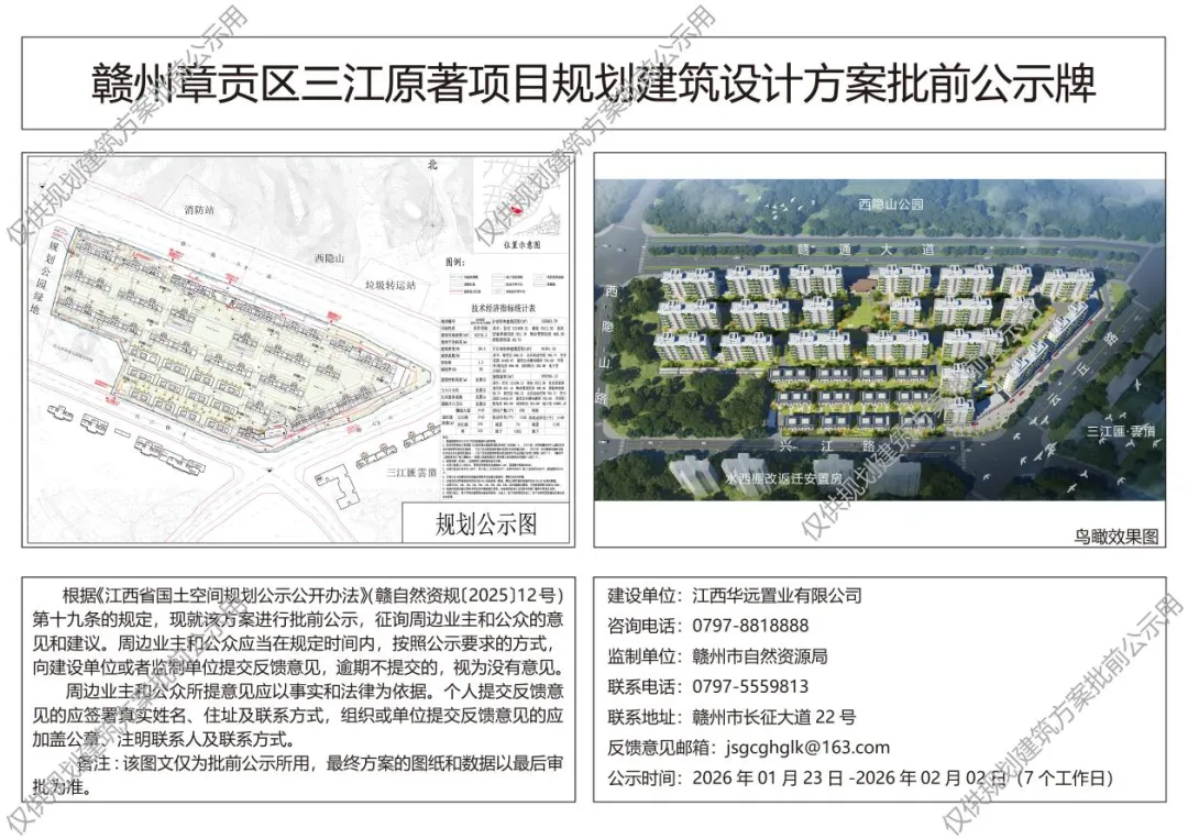 该项目位于水西组团SX05-05-02-01地块(兴江路北侧、云丘路西侧),建设单位为江西华远置业有限公司,规划用地性质为居住用地(二类城镇住宅用地、含配套商业、城镇社区服务设施用地),建筑用地面积83776.3㎡(125.66亩),规划条件主要指标要求:容积率≤1.5,建筑密度≤30%,绿地率≥30%,建筑高度≤36米,住宅、配套商业、社区服务设施须配建机动车停车位≥1.0个/100㎡建筑面积,住宅配建非机动车停车位≥1.2个/100㎡建筑面积,配套商业、社区服务设施配建非机动车停车位≥3.0个/100㎡建筑面积;地块内须按照每百户不低于20㎡的标准配套建设养老服务设施,且人均不低于0.1㎡,单处用房建筑面积不得少于300㎡;须按总建筑面积的2‰配建物业管理用房,且最低不得小于120㎡,其中业主委员会办公用房不小于20㎡;须按室内人均建筑面积不低于0.1㎡或室外人均用地不低于0.3㎡配建体育健身活动场地和设施;婴幼儿照护服务设施在邻近的SX05-05-02-02地块统一配建,本地块可不再额外配建。 本次规划建筑方案共布局34栋住宅,分别为22栋10至11层、12栋4层,沿赣通大道和云丘路设置公共配套设施及商业,分别为4处一层配套商业、5处开闭所和配电房、3处物业管理用房、位于13#首层的1处居家养老服务用房(详见规划批前公示图文)。用地面积为83776.3㎡,总建筑面积为207245.12㎡(计容建筑面积125663.79㎡,不计容建筑面积81581.33㎡),容积率为1.5,建筑密度为26.3%,绿地率为30%,停车位按照《关于优化规划管控要求促进我市住宅品质提升的若干措施》(试行)的要求进行设置,机动车停车位为1126个、非机动车停车位为1140个,社区居家养老用房为301.18㎡,物业管理用房为400.36㎡,建筑高度(不含装饰构件)最高为34.9米。 现就该项目规划建筑方案情况征询周边业主及公众的意见和建议。 公示时间:2026年1月23日至2026年2月2日(7个工作日) 备注:该图文仅为批前公示所用,最终方案的图纸和数据以最后审批为准。小野从【三江原墅】项目获悉,单价5888元/㎡起,开发商承诺:“首开保价,降价退差价!新规四代洋房,买110㎡得180㎡!层层有庭院,户户大花园!”