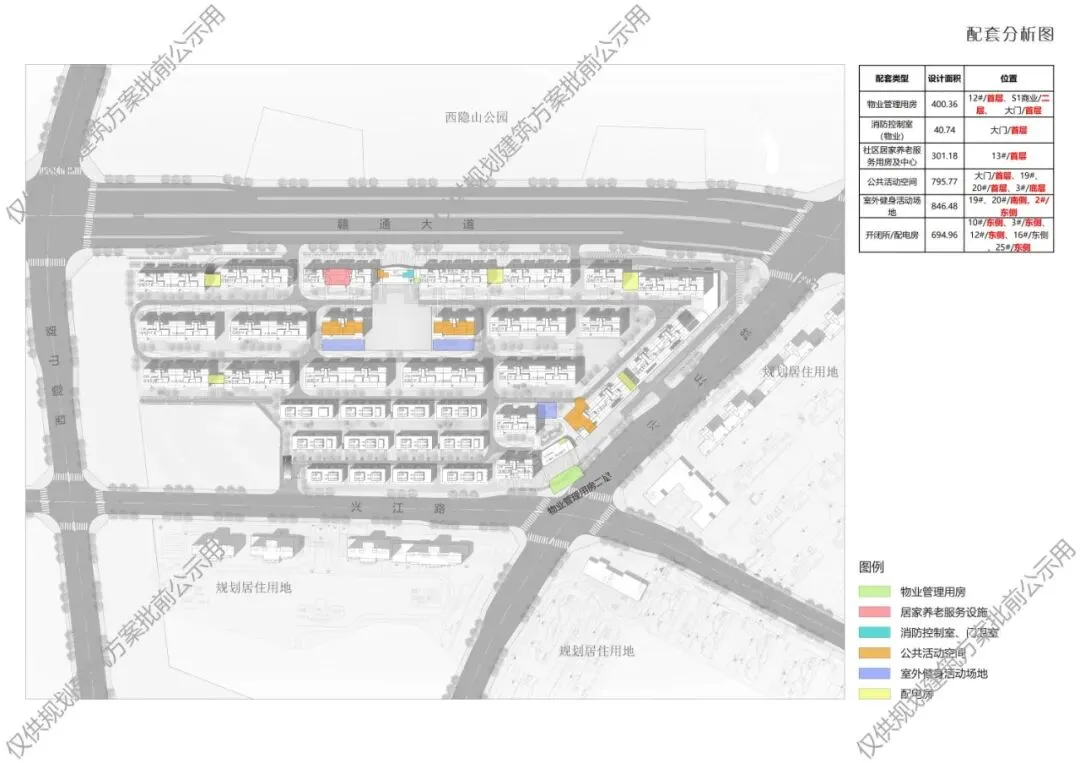 本次规划建筑方案共布局34栋住宅,分别为22栋10至11层、12栋4层,沿赣通大道和云丘路设置公共配套设施及商业,分别为4处一层配套商业、5处开闭所和配电房、3处物业管理用房、位于13#首层的1处居家养老服务用房(详见规划批前公示图文)。