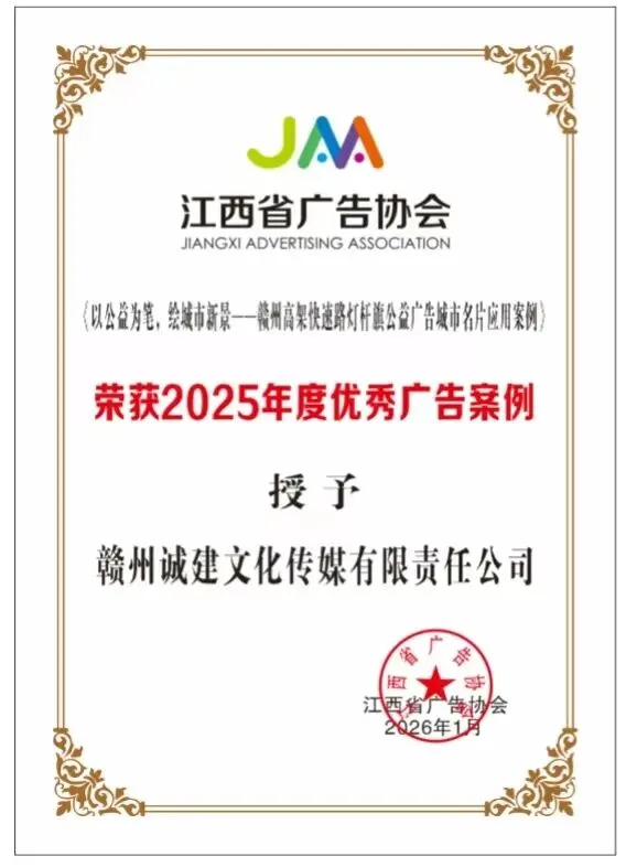 2026年1月23日,江西省广告行业年度盛会——江西省广告协会五届五次会员代表大会在江西吉安隆重召开。赣州城投集团旗下赣州诚建文化传媒有限责任公司(以下简称:“赣州诚建文化”)受邀参会,凭借扎实的综合服务能力与创新实践,一举斩获两项重磅荣誉:成功获评“江西省一级广告企业(综合服务类)资质”,成为全省广告综合服务领域的标杆企业;同时报送的《以公益为笔,绘城市新景——赣州高架快速路灯杆旗公益广告城市名片应用案例》获评江西省优秀广告案例,实现资质与案例的双重突破。