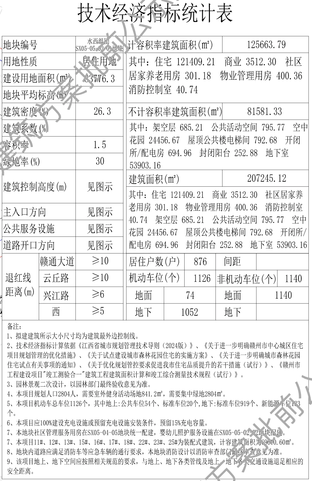 项目占地面积达 83776.3㎡,容积率 1.5,总建筑面积 207245.12㎡(计容建筑面积 125663.79㎡ 和不计容建筑面积 81581.33㎡),一共有 34 栋住宅,包括 22 栋 10-11 层的四代住宅、12 栋 4 层新规联墅,总户数 876 户,机动车停车位 1126 个,体量很大。除了住宅,项目沿赣通大道和云丘路还配备有公共配套设施及商业。从效果图可以看到,小区的大门采用新中式设计,高度 10 米,位于小区北侧,靠西隐山公园一侧,现在的售楼部是未来的物业用房。大门临近公园,以后前往公园和学校会比较方便,不过公园旁规划有一个垃圾转运站,对部分楼栋会有一定的不利影响。▲ 赣州三江原墅项目技术经济指标