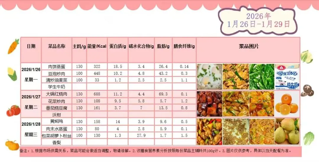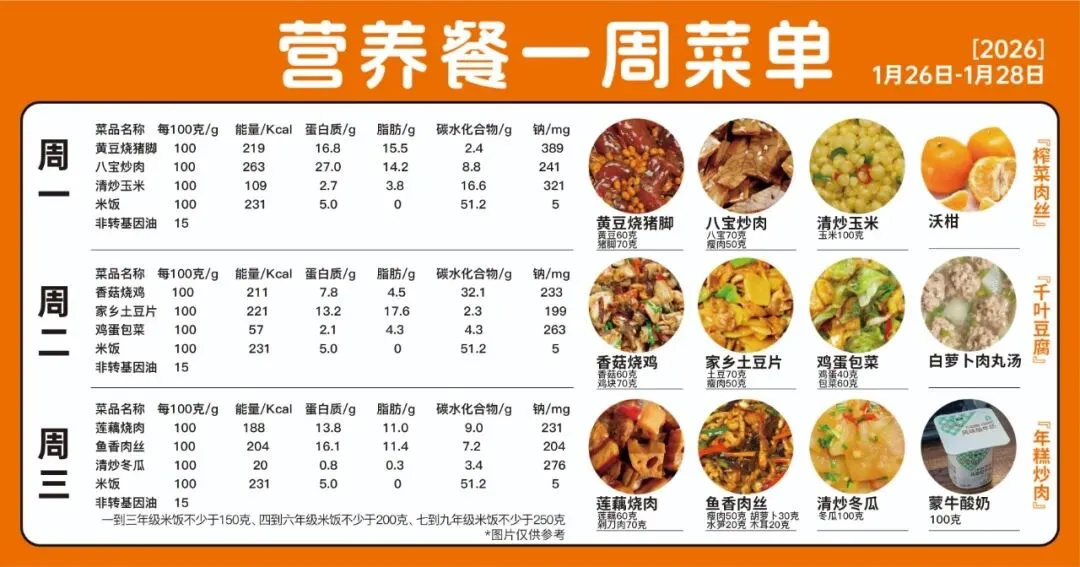 说明:上述带量食谱数据仅作为膳食营养均衡推荐摄入量,学生可按需取量。