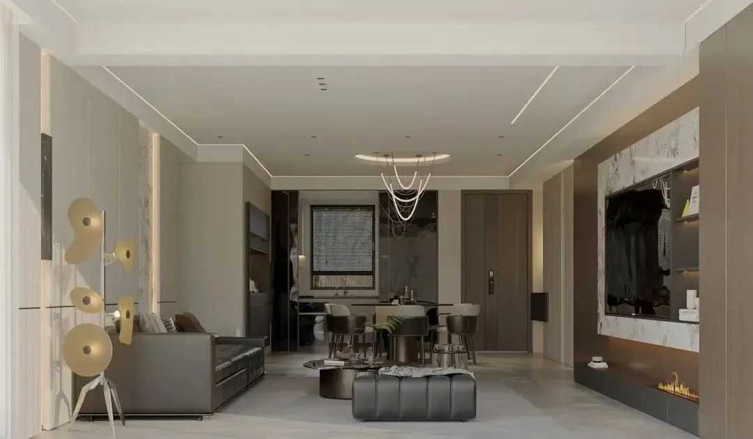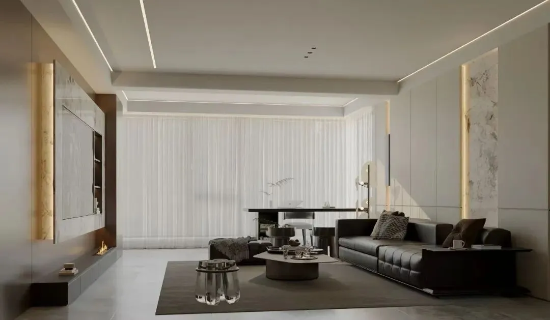 - 奢华质感天然大理石电视背景墙与木饰面形成材质对话,内嵌壁炉与悬浮式设计提升精致感。