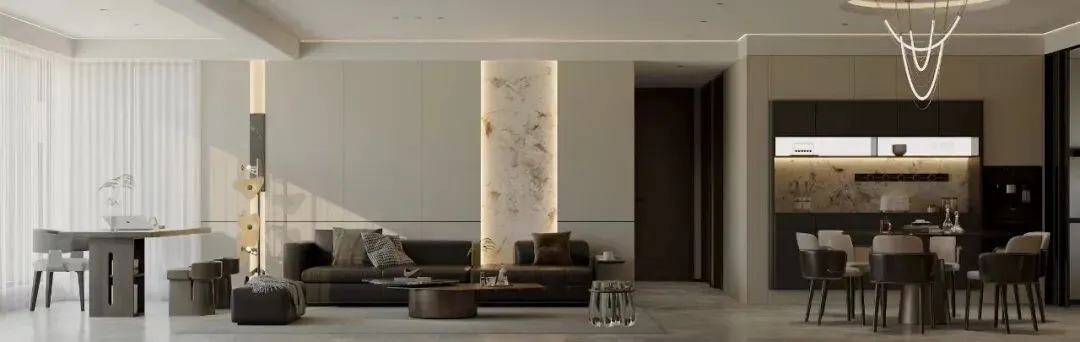 在开阔的客厅与餐厅区域,空间以深棕、米白与高级灰多个大地色为基调,勾勒出沉稳大气的意式风骨。