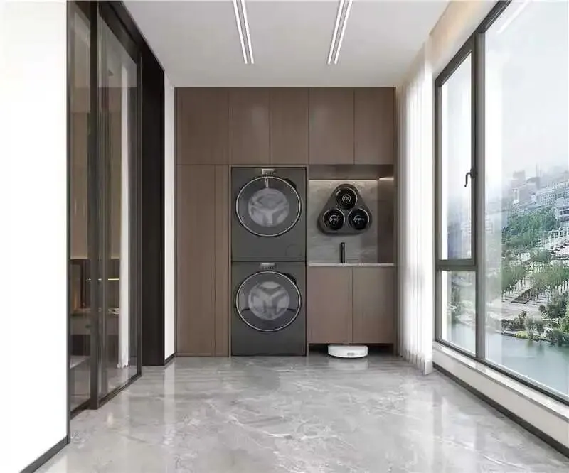 - 一体化木饰面与嵌入式洗烘设备,功能区也保持视觉整洁。极窄玻璃门与大理石地面,延续了整体空间的高级质感。