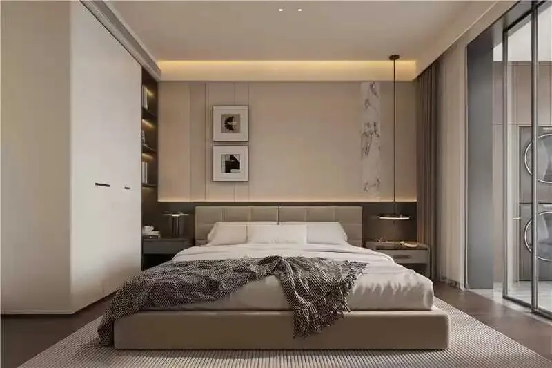 - 奢华质感床头背景墙的立体格栅与悬浮吊顶暗藏灯带,艺术挂画与金属壁灯的搭配,赋予空间优雅的仪式感。