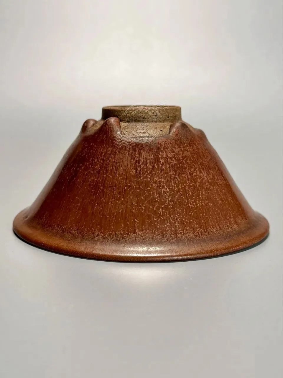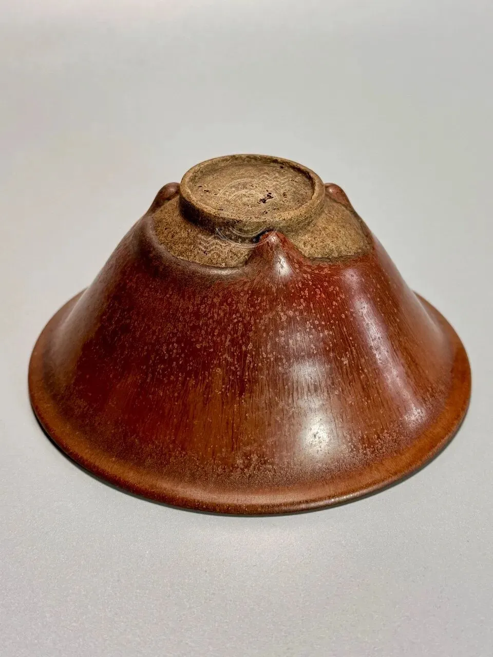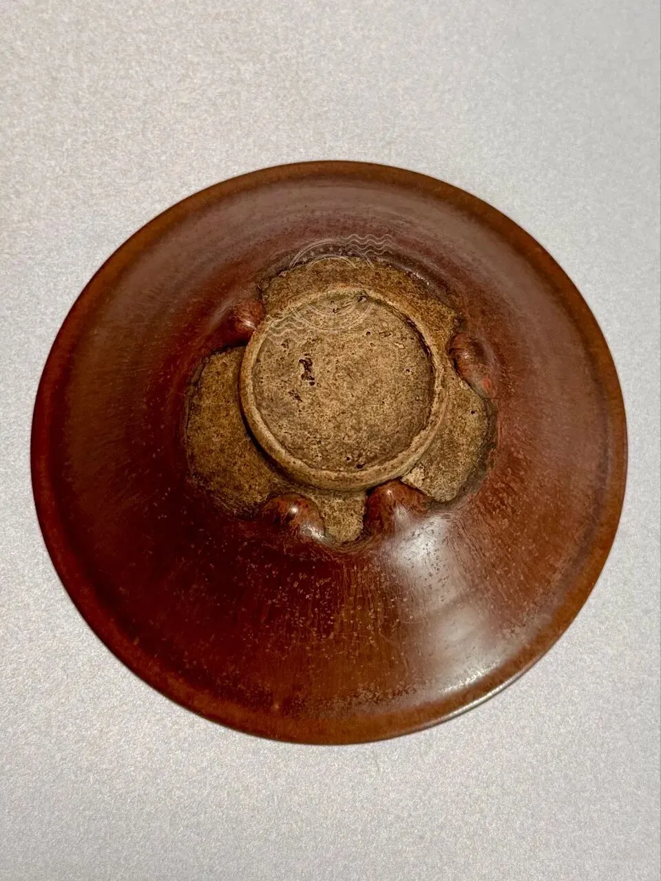 除了釉色之奇,此盏的器型与工艺细节亦处处彰显其不凡身份。其撇口造型线条外扩舒展且大气从容。在宋代建盏造型以束口为主,而精美的撇口盏存世相对较少。一件口径超过12厘米的撇口盏在拉坯时需确保胎体厚薄极度均匀,才能经受住高温考验而不变形,其成型与烧制难度均要高于其它相同大小的器型。