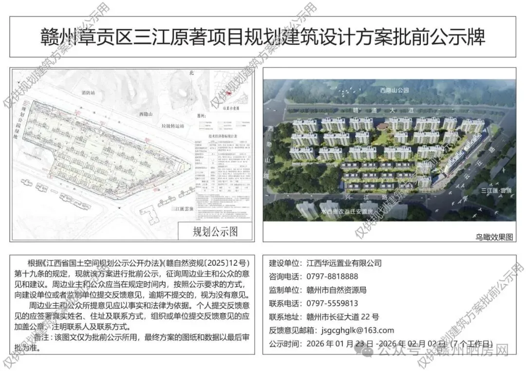 近日,政府官网发布了赣州章贡区三江原著项目规划建筑方案批前公示。