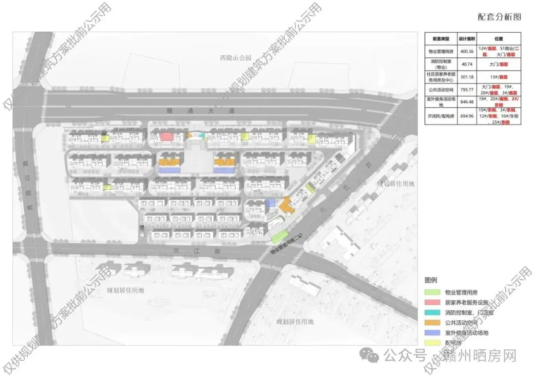 本次规划建筑方案共布局34栋住宅,分别为22栋10至11层、12栋4层,沿赣通大道和云丘路设置公共配套设施及商业,分别为4处一层配套商业、5处开闭所和配电房、3处物业管理用房、位于13#首层的1处居家养老服务用房(详见规划批前公示图文)。