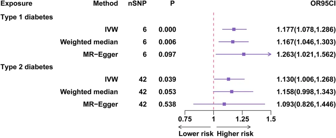 T2D与 HS 存在正向的因果关联(OR:1.13,95% CI:1.09 - 1.17,P < 0.0001),而与瘢痕疙瘩(keloids)存在负向关联(OR:0.95,95% CI:0.92 - 0.99,P = 0.016)。T1D与这两种瘢痕类型均无显著的因果关系。