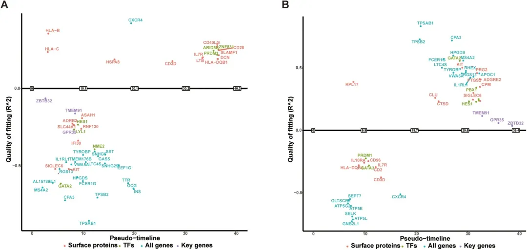 伪时间轨迹分析进一步揭示了这些基因的表达动力学存在差异,表现为早期丢失和后期上调。