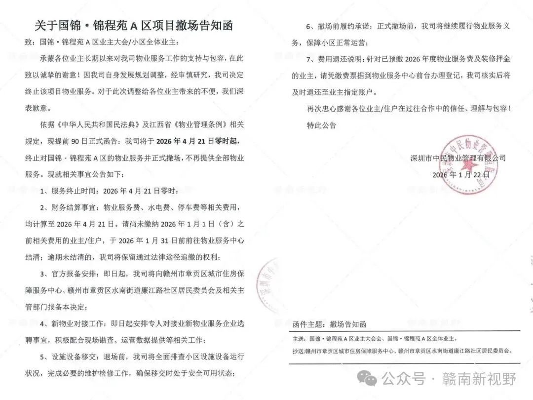 国锦·锦程苑A区由赣州市国投集团下属国锦房地产公司开发,位于章江新区J19地块,东侧为长岗路,南侧为红都大道,西侧为五指峰路。小区住宅楼栋4栋,楼层由5到8层不等,均安装有电梯,共计94套房源,车位总数129个。此次国锦·锦程苑A区物业的撤场,是市场与企业规划调整下的正常变动,也标志着小区物业服务即将进入一个新的阶段。物业服务关乎千家万户的日常,其平稳过渡与持续优化,离不开业主、物业企业与相关各方的共同努力。期待在各方协作下,国锦·锦程苑A区能顺利迎来更契合需求的服务方案,共建和谐宜居的社区环境。