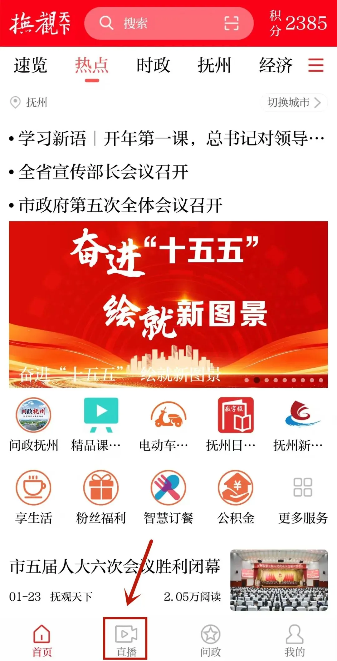 点击底部“直播”选项