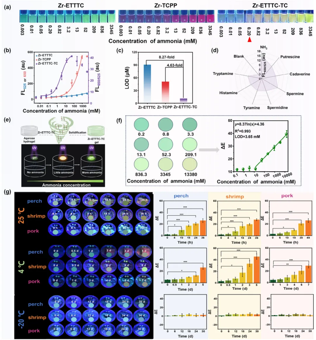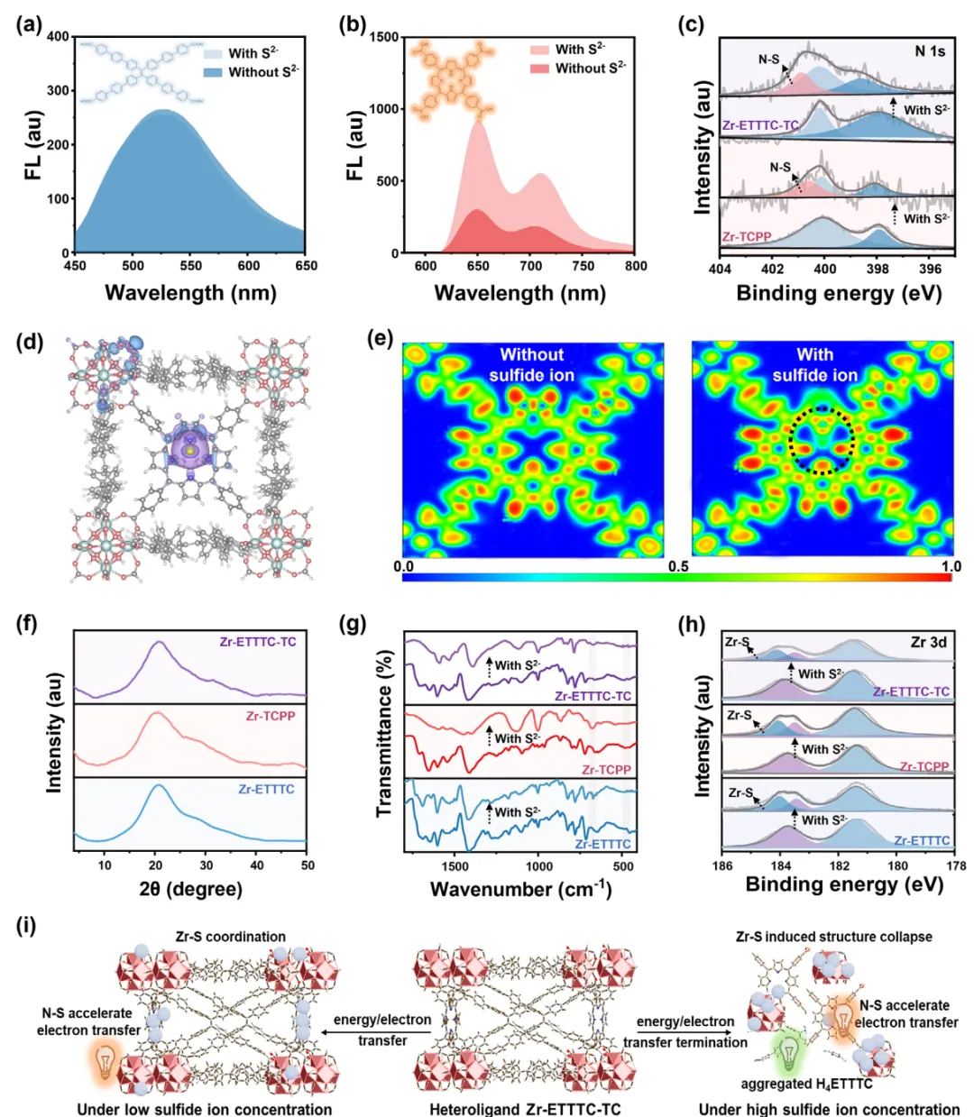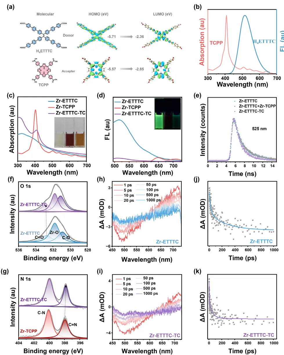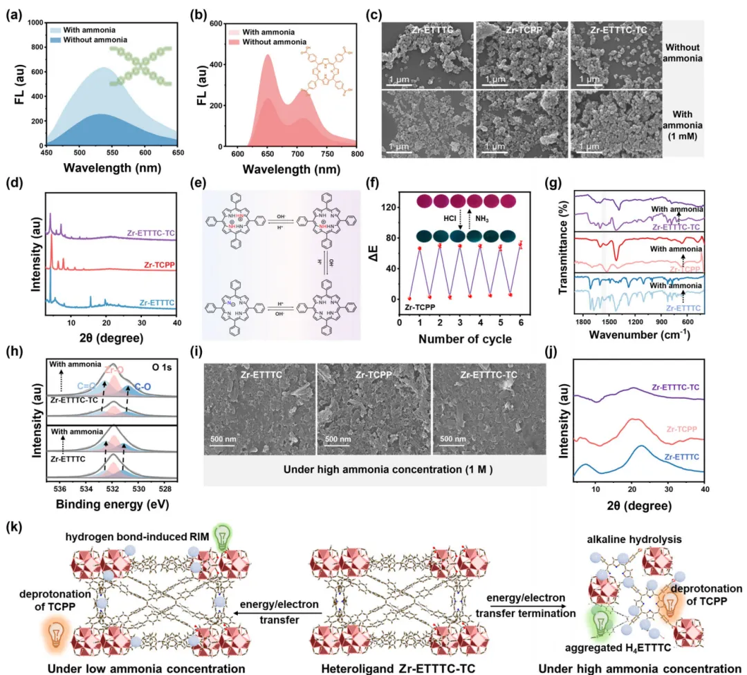 本文方法:本研究创新性地提出了一种异配体MOF设计策略。将两种发光特性相反的配体——AIE配体(H₄ETTTC,聚集诱导发光) 和 ACQ配体(TCPP,聚集导致猝灭)——整合到同一个锆基MOF(Zr-ETTTC-TC)骨架中。AIE配体作为电子供体,ACQ配体作为电子受体。在受限的MOF环境中,通过Förster共振能量转移(FRET) 和光诱导电子转移(PET) 的协同作用,有效猝灭了供体的荧光;同时,ACQ配体因聚集而进一步淬灭自身荧光,从而实现了近零背景的初始发射状态。