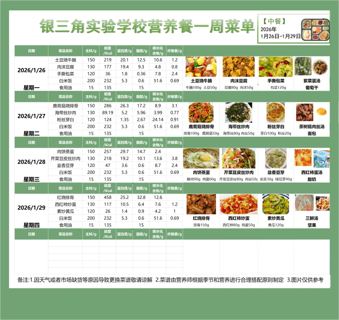 大家好!为了守护每一位师生的舌尖安全,我们每周公示校园餐菜单,确保饮食透明,健康相伴。今天,我们为大家带来本周(1月26日至1月29日)的校园餐精彩预告。