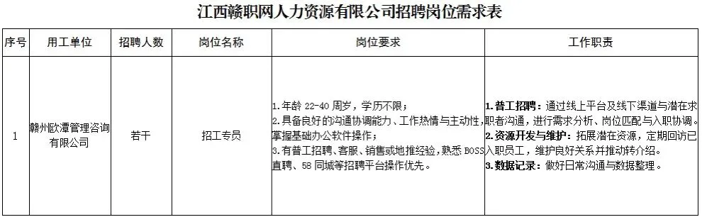 江西赣职网人力资源有限公司是赣州经开区人才发展集团有限公司二级子公司。因工作需要,招聘工作人员若干名,派至赣州欧潭管理咨询有限公司承担具体工作。现将有关事项公告如下: