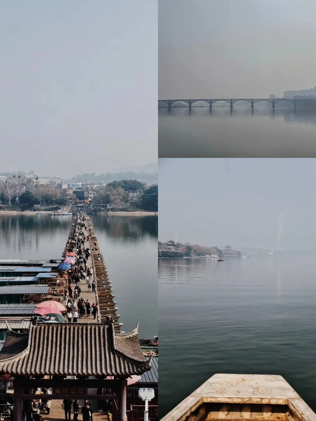 沿着道路走到尽头,能看到“江南宋城”的城墙。此宋城非杭州“宋城”,这可是从北宋定型,延续千年的真实古城。赣州在宋代发展最为成熟,古称虔(qian)州,在南宋时期是全国36座大城市之一,并作为海上丝绸之路的重要水路枢纽而繁荣。“江南宋城”的核心区域是3.6KM的砖城墙。走在城墙上面可以眺望“东河浮桥”的全貌。浮桥始建于宋乾道年间,距今将近1000年,由130多只小舟板铺设并联而成,整座浮桥分为33组,长约400米宽5米,固定在江面之上。这座桥不但保持了浮桥的原有形态,而且至今还连接着贡水两岸,为居民过江提供便利。走上浮桥后,没有摇晃的感觉,能欣赏浮桥两旁的水上市场,在这里人们摩肩接踵,热闹非凡,各种干制的鱼挂在摊位上,走近还能闻到浓郁的大海味道。