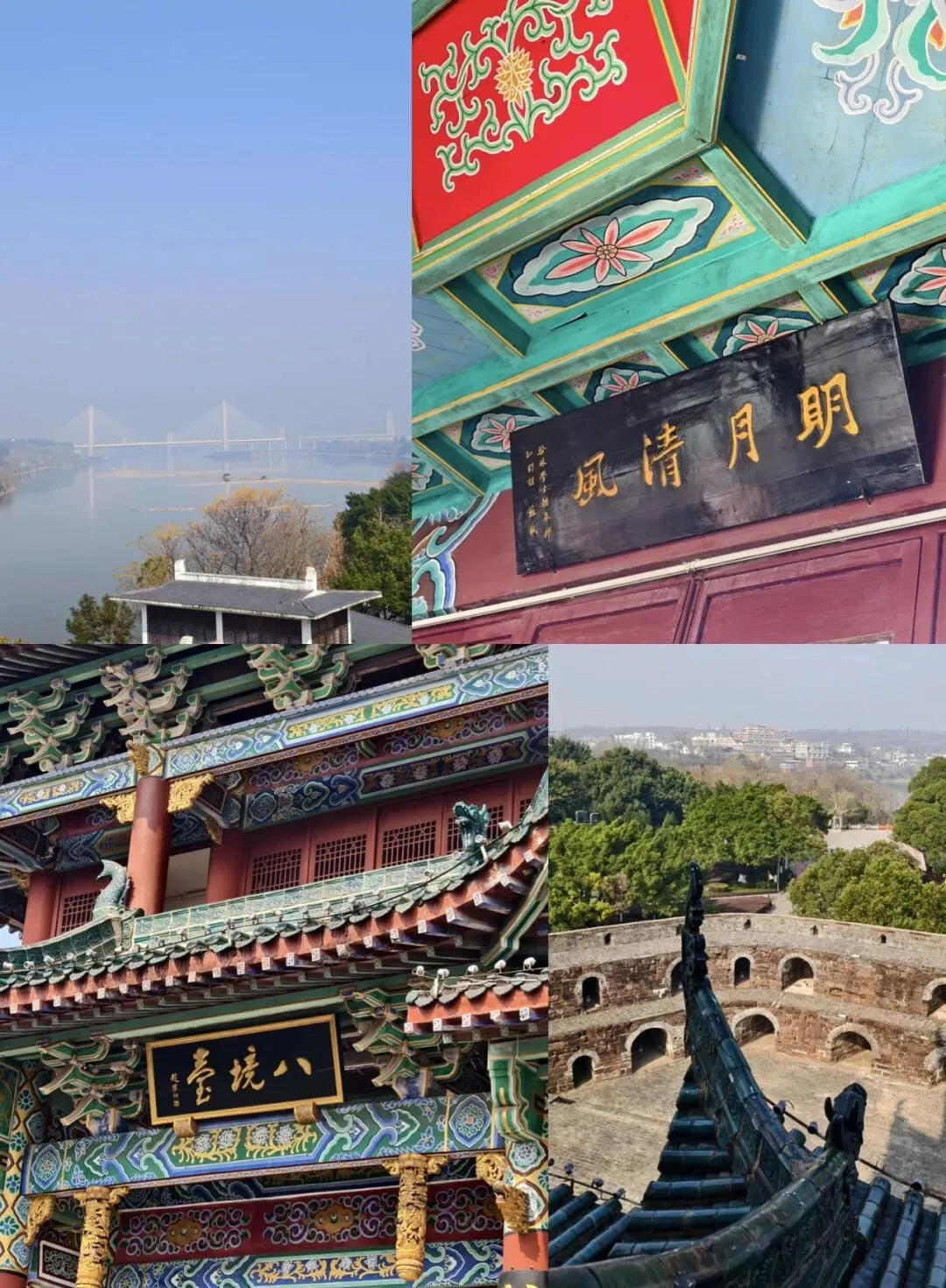 顺着城墙向北走,一会就能走到“八境台”。这个地方原为当时虔州知州孔宗翰所建,原名“石楼”,因他绘制了《虔州八境图》,请苏东坡题词后名声大噪,在这里开创了“八景文化”的先河,于是改名为“八境台”,吸引了很多文人墨客。登上台后能看到底下瓮城和东坡先生题的“明月清风”匾,也能浅看(有树遮挡)两江汇流的景象。八景分别为:三台鼎峙,二水环流,玉岩夜月,储潭晓镜,马崖禅影,天竺晴岚,宝盖朝云,雁塔文峰。不得不说,古人审美确实在线,中国人对山水风景的热爱都揉进了这书画当中。