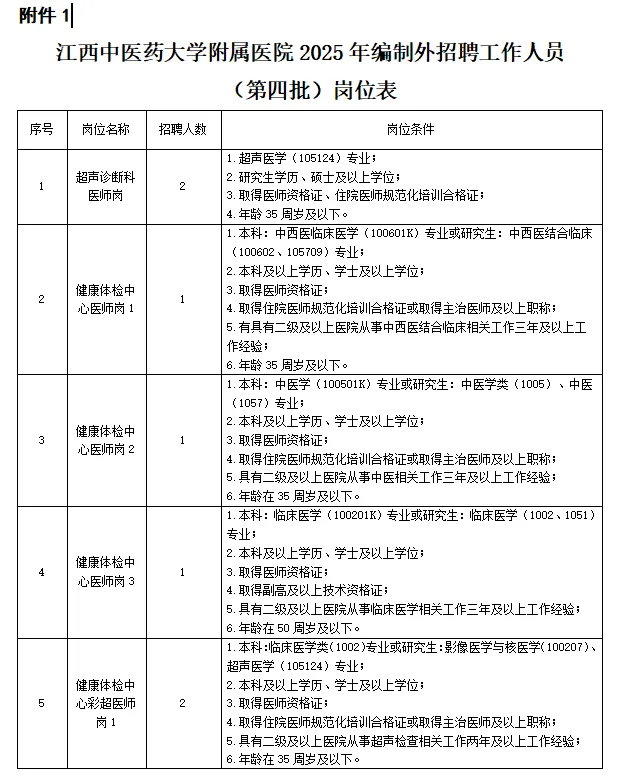 附件1:江西中医药大学附属医院2025年编制外招聘工作人员(第四批)岗位表