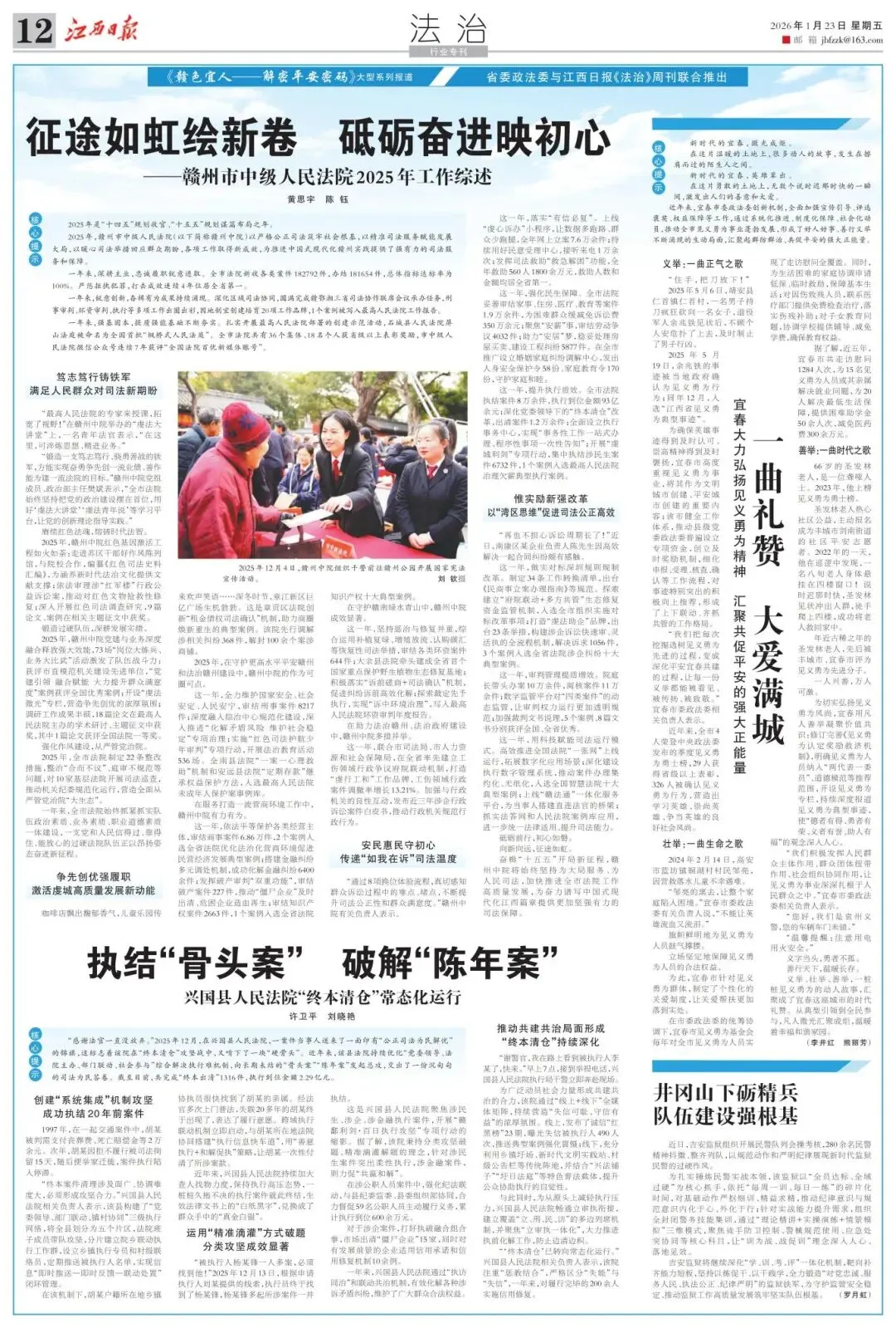 这一年,提升执行质效。全市法院执结案件8万余件,执行到位金额93亿余元;深化党委领导下的“终本清仓”改革,出清案件1.2万余件;全面设立执行事务中心,实现“事务性工作一站式办理、程序性事项一次性告知”;开展“虔城利剑”专项行动,集中执结涉民生案件6732件,1个案例入选最高人民法院治理欠薪典型执行案例。