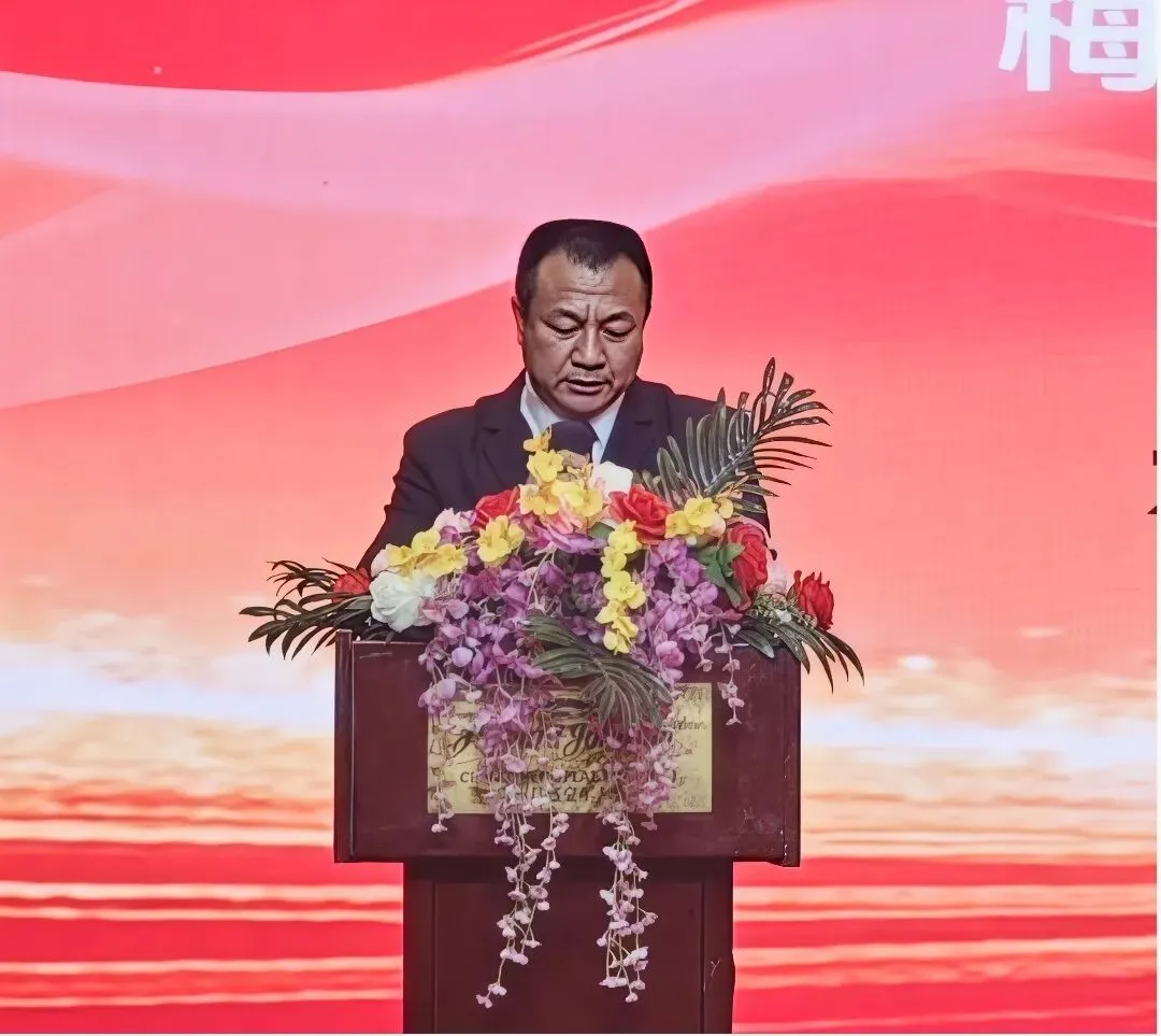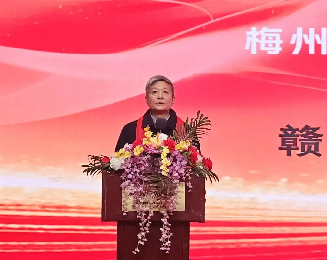 庄席福代表广东省江西赣州商会向大会的召开致以热烈祝贺。他表示,赣州与梅州同属客家文化的重要承载地,语言相通、人文相亲,为两地经贸往来与合作提供了天然纽带。他称赞梅州市江西赣州商会虽成立时间不长,但展现出充沛活力与浓厚乡情,并祝愿商会在新的一年会务昌隆、团结带领会员企业共创佳绩。