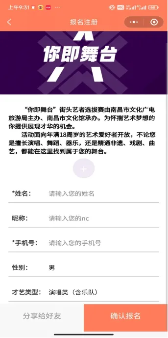 2.关注南昌市文化馆微信公众号,进入“你即舞台”报名通道;