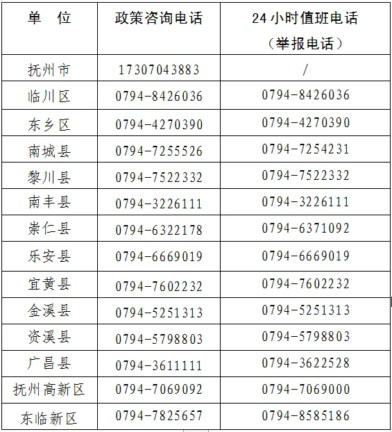 抚州市市、县两级疫情防控指挥部政策咨询及值班电话