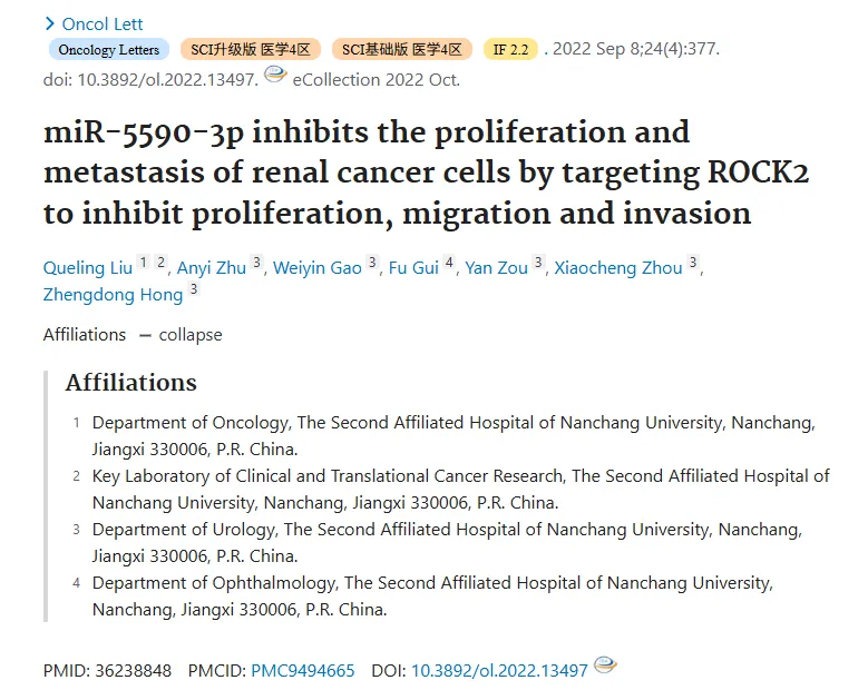 题目:miR-5590-3p inhibits the proliferation and metastasis of renal cancer cells by targeting ROCK2 to inhibit proliferation, migration and invasion