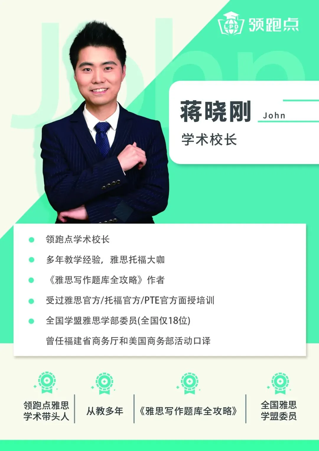 蒋晓刚老师作为学术校长,不仅是《雅思写作题库全攻略》的作者,还受过雅思官方、托福官方、PTE官方面授培训,曾任福建省商务厅和美国商务部活动口译,凭借深厚的学术功底与丰富的教学经验独创“蒋氏雅思教学法”。该教学法通过“关键词预判法”“同义替换捕捉技巧”等实用方法论,将复杂的考点转化为通俗易懂的解题逻辑,尤其在听力、阅读单项提分上成效显着,帮助无数学员突破分数瓶颈。