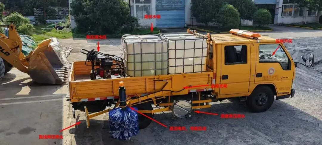 该中心自主研发双高压喷头冲洗设备,采用高压圆盘旋转喷头均匀喷洒清洗剂,全面提升路面去污能力;配合高压直线喷头针对顽固污渍实施定点强洗,实现路面深度清洁。该设备适配双排座车辆,可借助现有洒水车及回收水箱实现循环供水,在确保清洁效果的同时,有效节约设备投入与水资源消耗。目前该装置已于永武高速全线投用,道路清洗周期由原先的34.67日缩短至20.8日。