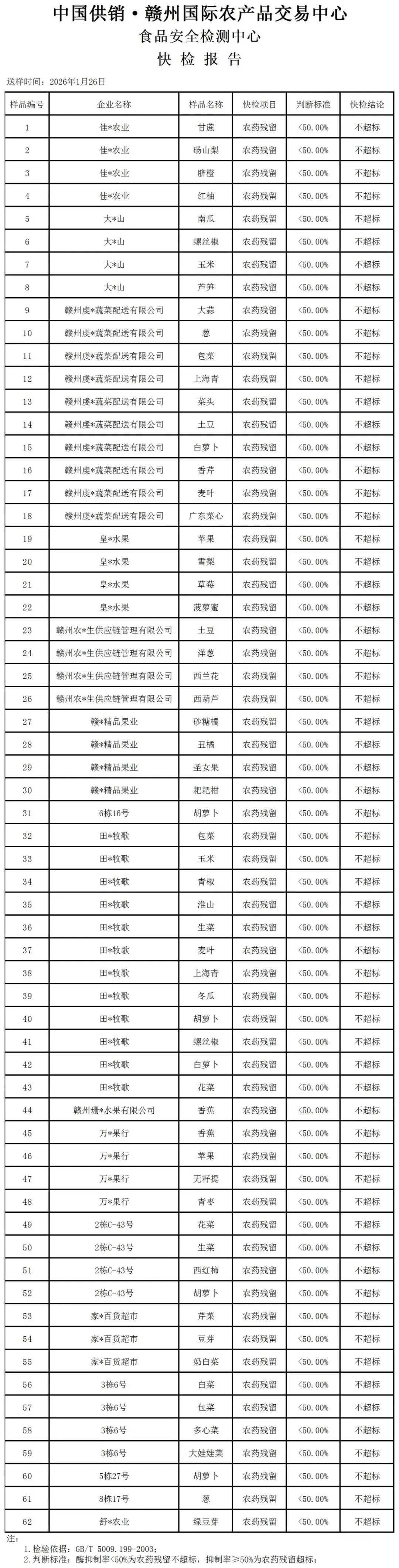 >赣州中农批市场2026年1月26日农产品农残抽样检查