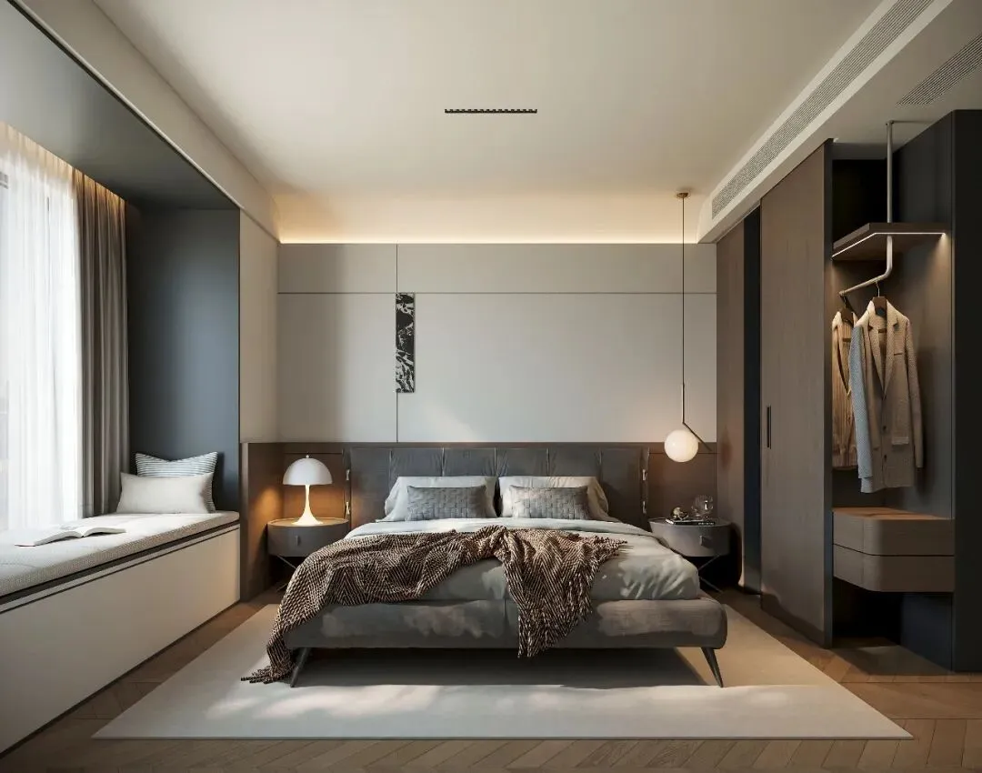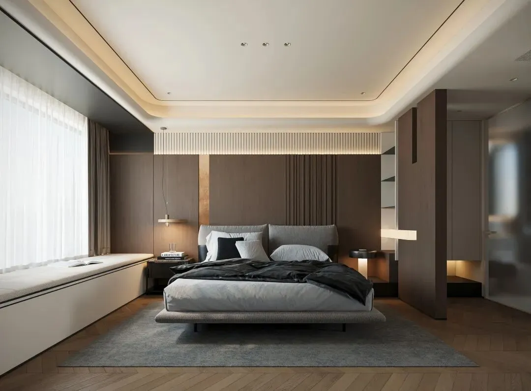 - 氛围营造深咖木饰面与床品构建出温暖沉稳的基底,悬浮式床架与嵌入式灯光消解了空间的厚重感,营造出松弛舒适的睡眠氛围。