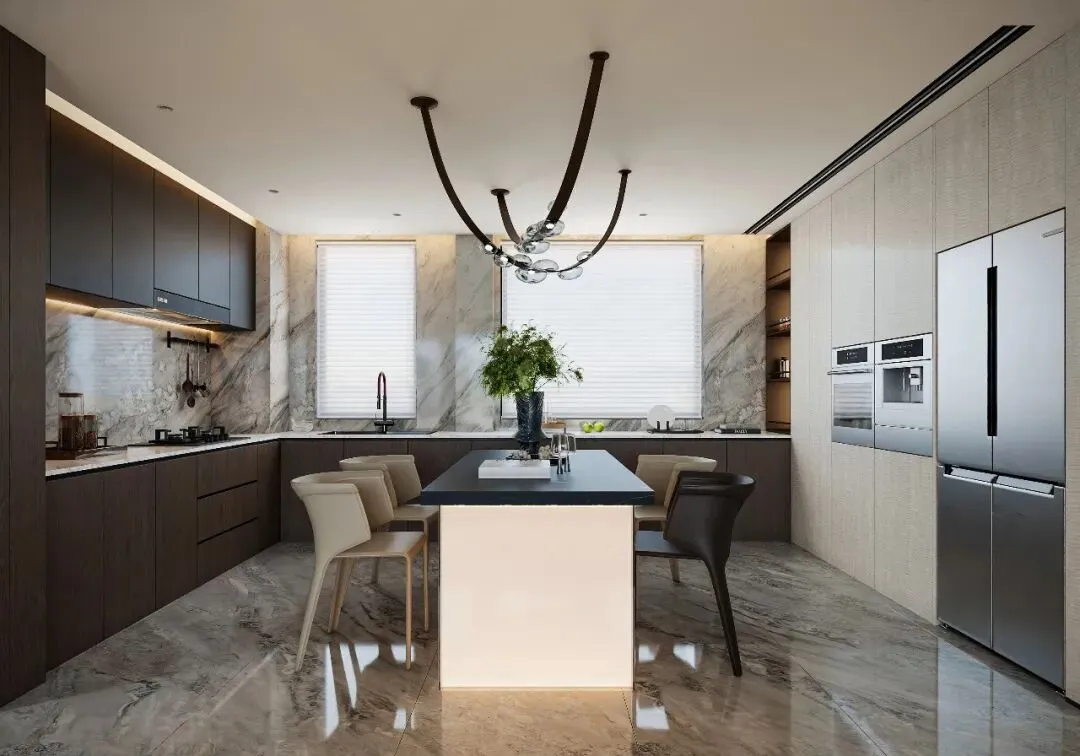 - 设计亮点开放式布局打破空间边界,深色橱柜与大理石台面相得益彰,让烹饪与用餐都充满仪式感。