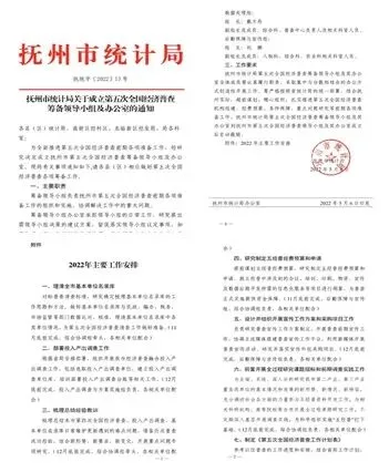 为推进全市第五次全国经济普查前期各项准备工作落到实处,5月6日,抚州市统计局印发《关于成立第五次全国经济普查筹备领导小组及办公室的通知》(抚统字〔2022〕13号),安排布置了五经普相关筹备工作。