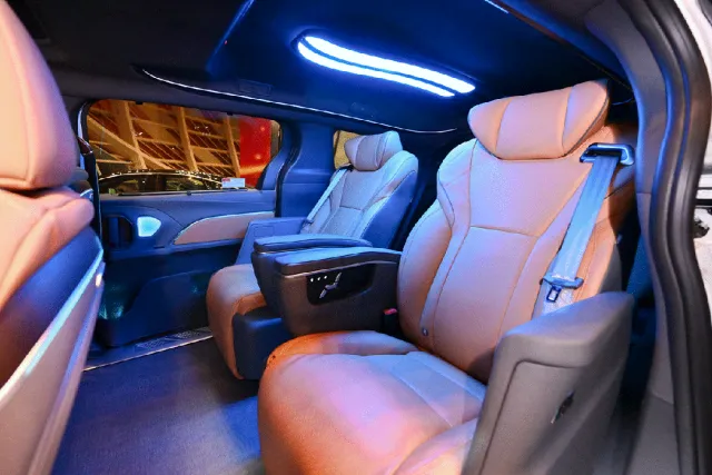 升级定制豪华航空座椅,标配原车安全气囊,支持电动调节躺平模式,兼具通风、加热、智能按摩功能;配备劳斯莱斯同款星空顶采用进口麂皮绒材质,搭配高级冲孔工艺,车内顶部空间提升 4-6cm,内部空间更开阔;具备流星、繁星等多种星空模式,支持声音联动控制。搭配 64色氛围灯,支持车机、手机等多端控制,多种场景一键切换。可选配吸顶娱乐系统与智能座舱系统,兼顾商途高效与家旅舒心。