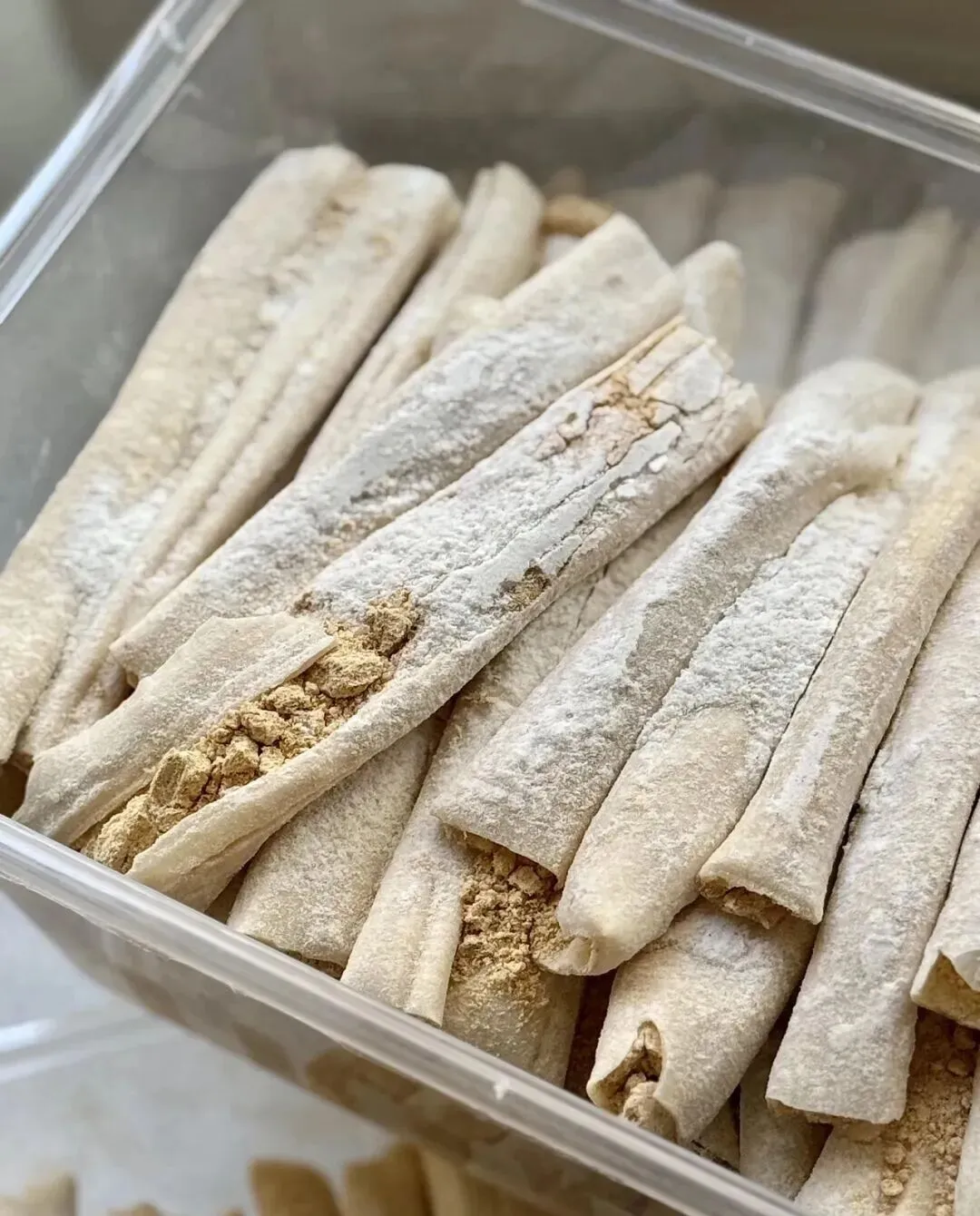 问了阿姨才知道 , 这叫灌芯糖 , 是她自己手工做的。 外面那层壳是麦芽糖拉出来的 , 又薄又脆 , 里面塞的是黄豆粉。 阿姨说黄豆粉的比黑白芝麻的还香 , 我半信半疑买了几根尝尝。