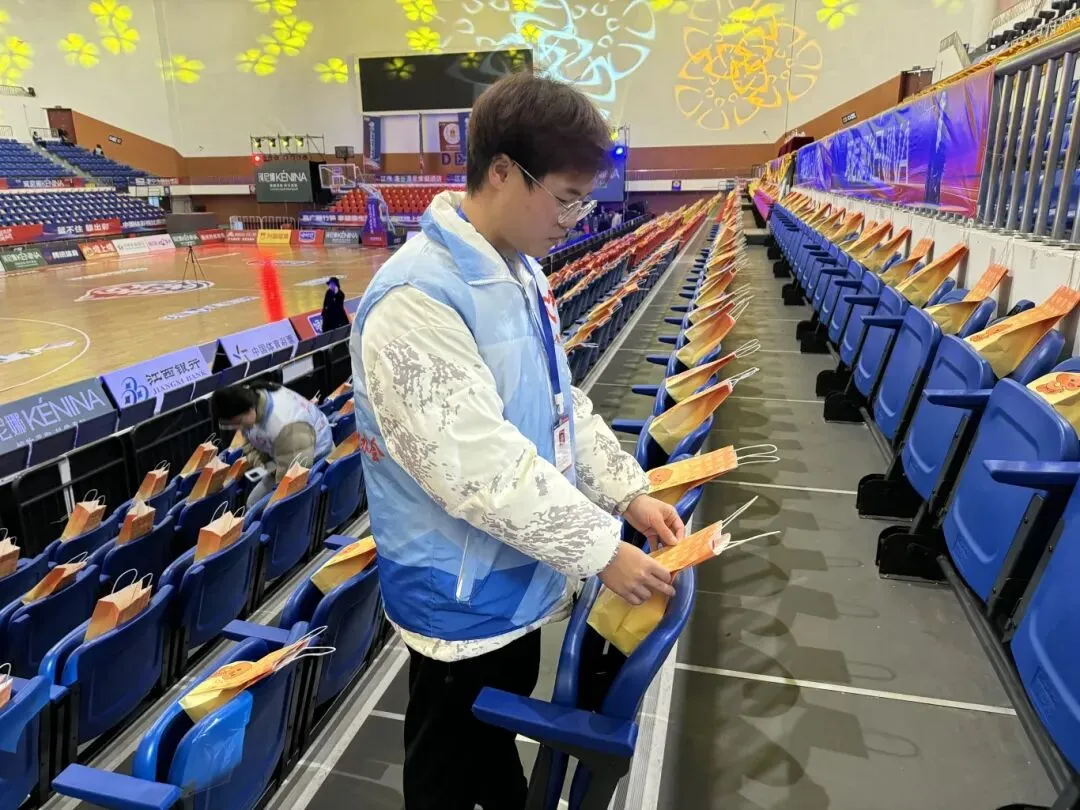 赛事负责人围绕检票流程、观众引导、应急处置等核心岗位进行培训。培训结束后,志愿者们将观赛礼品摆放至各观众席位。