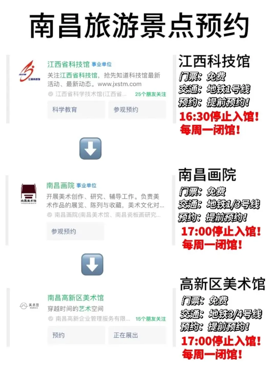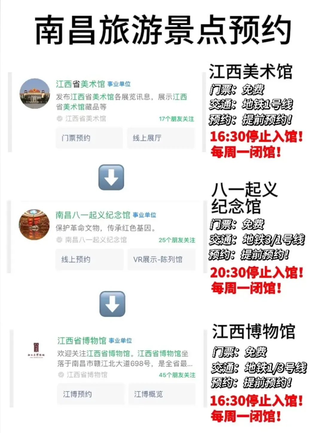 预约:八一起义纪念馆、江西省博物馆需提前预约,周一闭馆(法定节假日除外),滕王阁热门时段可能限流,错峰参观更佳。