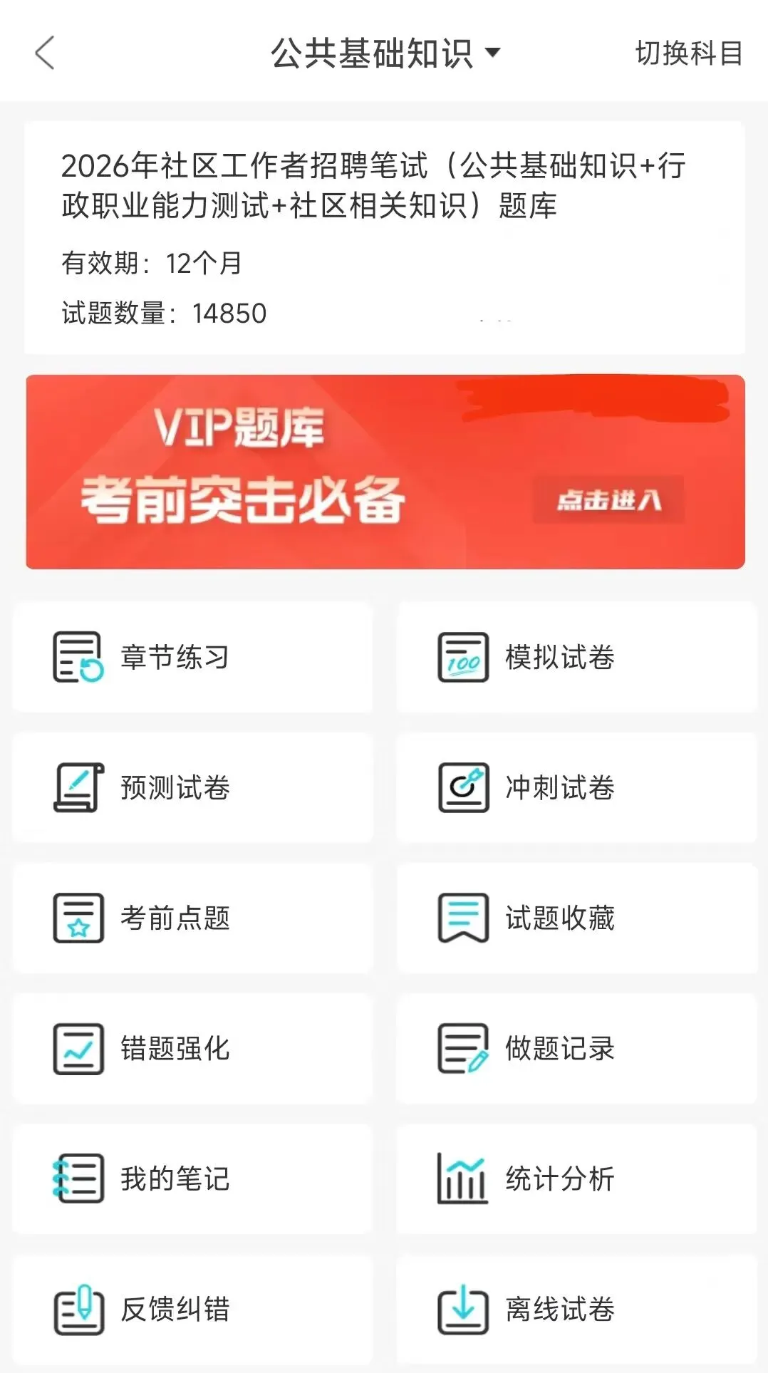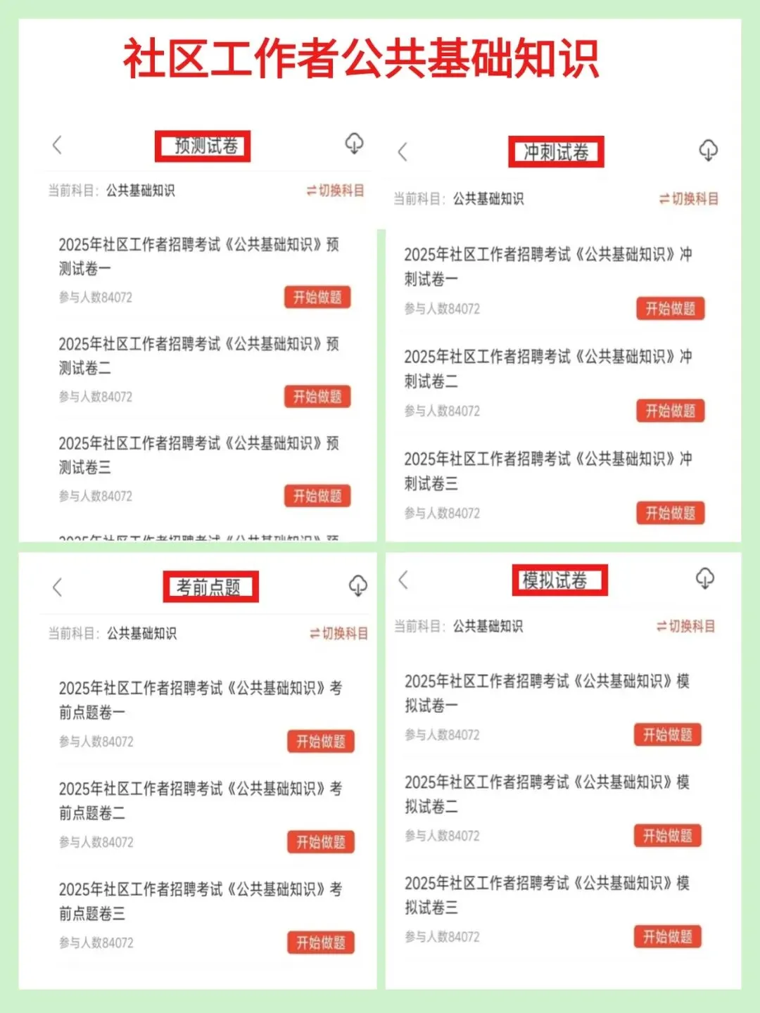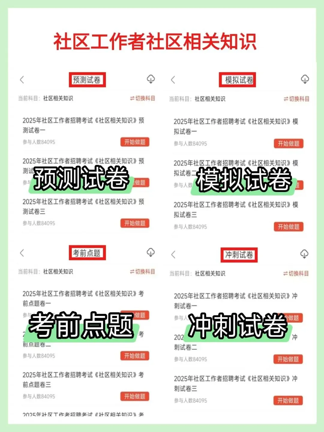 1. 考试内容全覆盖:✔公共基础知识(包括时事政治、法律法规、经济常识、政治理论、公文写作、党建知识、国情地理等)✔社区工作专业知识(社区基本概念、社区建设重点、居民自治实践、社会工作基础知识、社区管理与服务核心技巧等)✔行政能力测试(常识判断、判断推理、数量关系、言语理解与表达、资料分析等)2. 实用的学习功能:✔章节练习:可以按不同科目进行专项练习,打好基础✔模拟考试:完整的模拟试卷,做完就能知道自己的薄弱环节✔考前冲刺卷:专门为最后复习阶段准备的预测题✔收藏功能:可以把重要的题目收藏起来,方便重点复习✔错题本:自动记录做错的题目,复习时可以直接查看建议有报考意向的小伙伴尽早开始准备,这样考试时会更有把握,我们的资料可以帮助您系统性地复习,提高通过考试的几率哦图片仅为部分展示内容