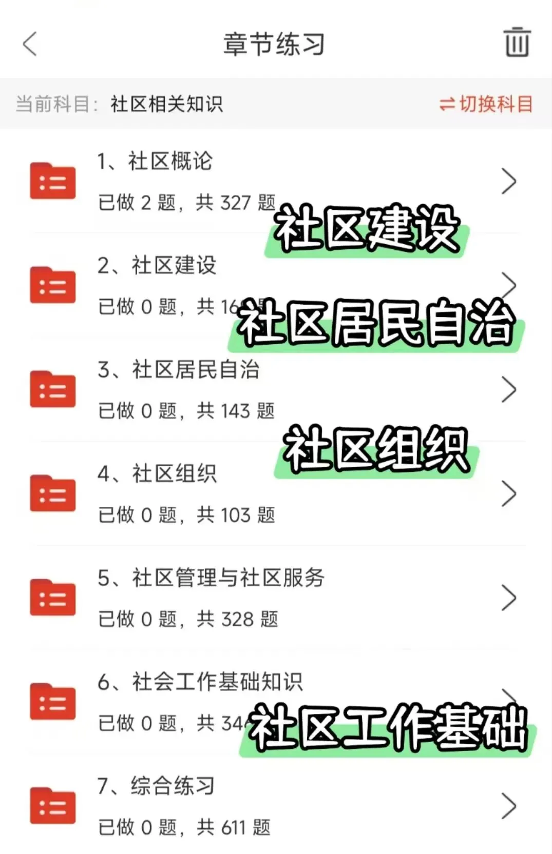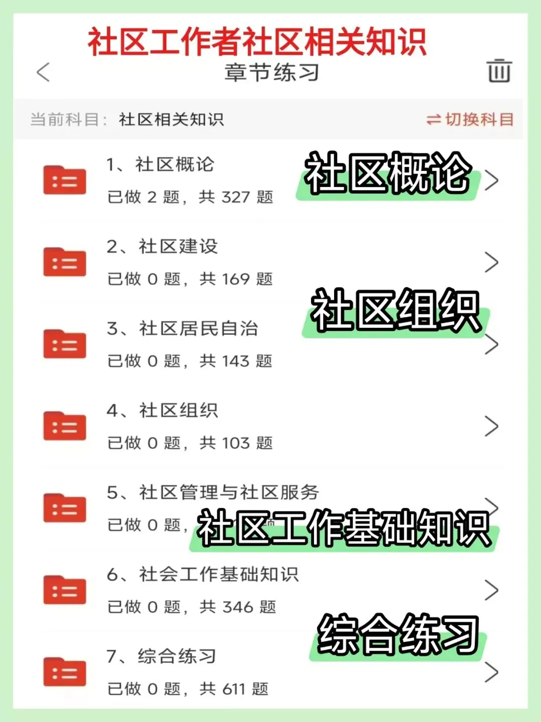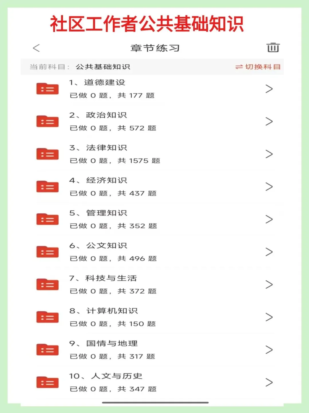 1. 考试内容全覆盖:✔公共基础知识(包括时事政治、法律法规、经济常识、政治理论、公文写作、党建知识、国情地理等)✔社区工作专业知识(社区基本概念、社区建设重点、居民自治实践、社会工作基础知识、社区管理与服务核心技巧等)✔行政能力测试(常识判断、判断推理、数量关系、言语理解与表达、资料分析等)2. 实用的学习功能:✔章节练习:可以按不同科目进行专项练习,打好基础✔模拟考试:完整的模拟试卷,做完就能知道自己的薄弱环节✔考前冲刺卷:专门为最后复习阶段准备的预测题✔收藏功能:可以把重要的题目收藏起来,方便重点复习✔错题本:自动记录做错的题目,复习时可以直接查看建议有报考意向的小伙伴尽早开始准备,这样考试时会更有把握,我们的资料可以帮助您系统性地复习,提高通过考试的几率哦图片仅为部分展示内容