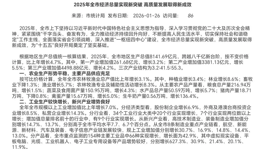 2025年南昌市经济总量实现新突破 高质量发展取得新成效!2025年,南昌市紧紧围绕“干字当头、奋发有为,全力推动经济持续回升向好,不断提高人民生活水平,切实保持社会和谐稳定”工作主线,全面落实省会引领战略,深入推进“一枢纽四中心”建设,全市经济总量实现新突破,高质量发展取得新成效,为“十五五”良好开局奠定了坚实基础。根据地区生产总值统一核算结果,2025年,全市地区生产总值8141.69亿元,跨越八千亿新台阶,按不变价格计算,比上年增长4.7%。其中,第一产业增加值261.68亿元,增长3.2%;第二产业增加值3381.13亿元,增长5.5%;第三产业增加值4498.88亿元,增长4.2%。三次产业结构为3.2:41.5:55.3。一、农业生产形势平稳,主要产品供应充足按可比价格计算,全年全市农林牧渔业总产值比上年增长3.1%。其中,种植业增长3.4%;林业增长8.6%;畜牧业下降1.3%;渔业增长5.7%;农林牧渔专业及辅助性活动增长8.3%。从主要农产品产量看,粮食总产量216.94万吨,增长1.5%;蔬菜及食用菌产量150.95万吨,增长4.3%;水产品总产量50.59万吨,增长5.7%;猪肉产量18.71万吨,下降0.8%;禽蛋产量15.67万吨,增长5.0%;生牛奶产量0.56万吨,增长136.4%。二、工业生产较快增长,新兴产业增势良好全年全市规模以上工业增加值比上年增长7.0%。分经济类型看,股份制企业增长6.9%,外商及港澳台商投资企业增长8.5%,私营企业增长14.3%。分行业看,34个工业行业大类中20个行业实现增长,7个行业实现两位数以上增长;增加值总量排名前十的行业中,有9个行业实现增长。从新兴产业看,高技术制造业、装备制造业增加值分别增长14.7%、13.7%,分别高于全市平均水平7.7、6.7个百分点。从全市8条制造业重点产业链看,航空、新能源、新材料、汽车及装备、电子信息产业链发展较快,规上工业增加值分别增长30.7%、16.9%、14.8%、14.4%、13.0%。分产品看,全市重点监测的154种主要工业品中66种实现增长,增长面为42.9%,其中虚拟现实设备、平板电脑、光缆、工业机器人、电子工业专用设备等产品增势较好,分别增长627.3%、30.9%、21.4%、20.1%、11.9%。三、民间投资保持活力,重大项目推进有力全年全市民间投资比上年增长3.1%,占全部投资比重达42.0%。工业投资增长11.3%,其中,制造业投资增长13.6%。高技术产业投资增长11.5%,其中,专业技术服务业的高技术服务、电子及通信设备制造业、航空航天器及设备制造业投资分别增长92.0%、67.5%、23.2%。全市1082个市重大重点项目完成投资占年度计划投资109.7%,超时序进度9.7个百分点;420个省大中型项目完成投资占年度计划投资105.7%,超时序进度5.7个百分点。四、消费潜力不断释放,网络零售持续活跃全年全市实现社会消费品零售总额2921.78亿元,比上年增长2.6%,其中,限额以上消费品零售额增长1.7%。按经营单位所在地分,城镇限上消费品零售额增长1.8%,乡村限上消费品零售额下降1.1%。按消费类型分,商品零售增长1.2%,餐饮收入增长7.2%。按商品类别分,监测的20个商品零售类别中12类商品零售额实现增长。基本生活消费稳定增长,饮料类、日用品类、粮油食品类商品零售额分别增长5.8%、3.8%、1.6%。绿色智能商品需求加速释放,高能效等级家电、智能手机、新能源汽车零售额分别增长87.9%、42.5%、35.3%。网上零售保持活跃,全市限上批发零售业企业通过公共网络实现商品零售额增长36.3%。五、财政收支总体平稳,金融存贷运行稳健全年全市地方一般公共预算收入完成537.77亿元,比上年增长2.2%,其中,税收收入完成325.35亿元,占一般公共预算收入比重为60.5%。财政支出保障有力,全市一般公共预算支出完成914.44亿元,其中,交通运输支出增长100.4%,资源勘探工业信息等支出增长26.2%,商业服务业等支出增长21.9%。2025年末,全市金融机构本外币各项存款余额19394.76亿元,比上年末增长7.1%。其中,住户存款余额8535.08亿元,增长12.9%;非金融企业存款余额6042.04亿元,下降1.5%。全市金融机构本外币各项贷款余额为21728.92亿元,增长5.0%。其中,企(事)业单位贷款余额16971.72亿元,增长7.6%;住户贷款余额4708.54亿元,下降3.1%。六、居民消费价格温和回升,新增就业稳步增长全年全市居民消费价格(CPI)比上年上涨0.4%。分类别看,八大类商品和服务价格同比“六涨两降”。其中,其他用品及服务价格上涨11.7%,衣着价格上涨2.8%,教育文化和娱乐价格上涨1.3%,医疗保健价格上涨0.9%,生活用品及服务价格上涨0.5%,居住价格上涨0.5%,食品烟酒价格下降0.6%,交通和通信价格下降2.4%。全年全市城镇新增就业90078人,累计完成数比上年上升21.9%。其中,城镇失业人员再就业22765人,累计完成数上升8.0%;就业困难人员实现再就业8217人,累计完成数上升4.7%。总的来看,2025年全市经济承压前行、稳中有进,高质量发展迈出坚实步伐。但也要看到,外部环境深刻变化带来的影响持续深化,供强需弱矛盾较为突出,经济发展中老问题、新挑战仍然不少。2026年,要坚持以习近平新时代中国特色社会主义思想为指导,深入贯彻习近平总书记重要讲话重要指示批示精神,围绕全面落实省会引领战略、深入推进“一枢纽四中心”建设,完整准确全面贯彻新发展理念,加快构建新发展格局,以高质量发展为核心,坚持稳中求进。统筹扩内需与优供给,推动科技创新与产业创新深度融合,做优存量、扩大增量,防范化解重点领域风险,着力稳就业、稳企业、稳市场、稳预期,推动经济实现质的有效提升和量