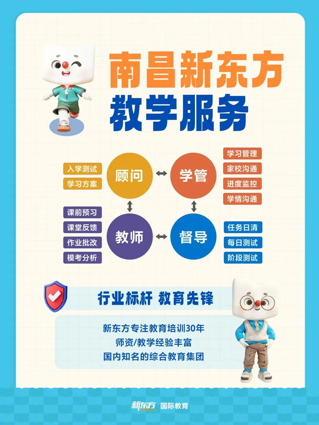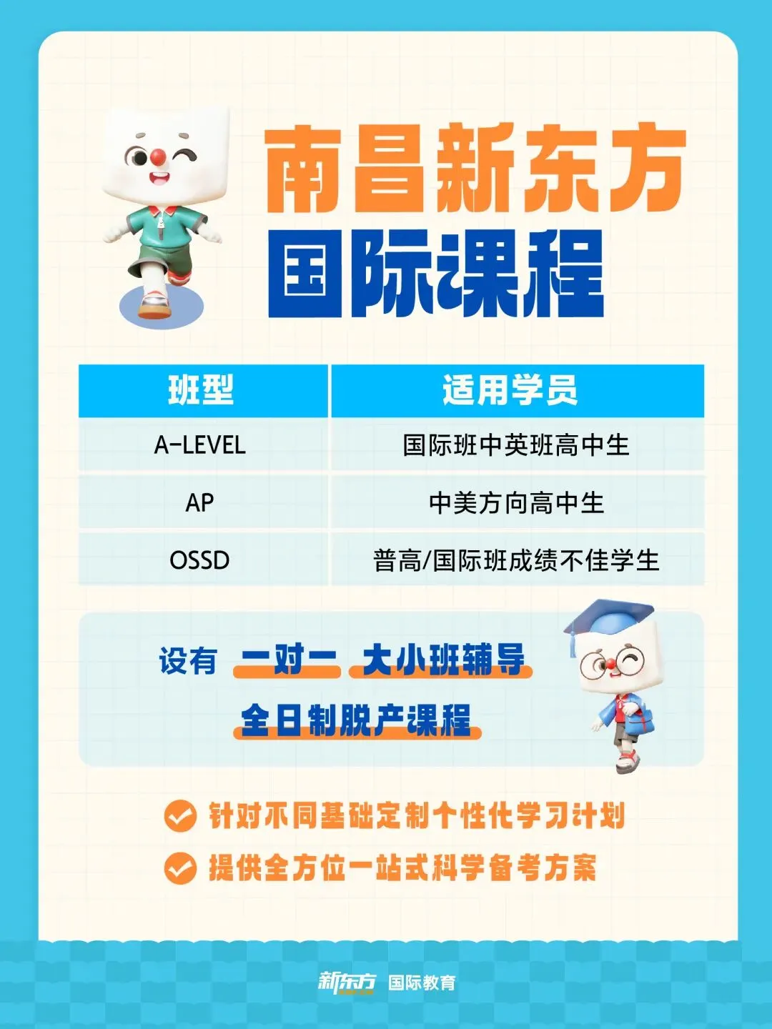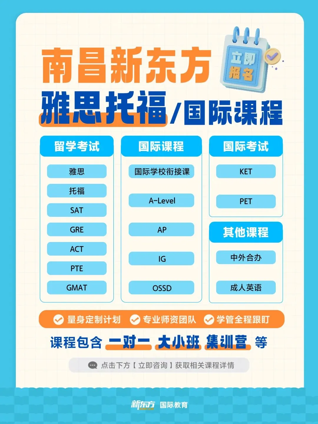 寒假和春季班课程涵盖多种班型,上课形式多样,线上/线下课程、小班/一对一课程应有尽有,满足不同学员需求。每季度优秀教师展示demo课,见贤思齐,教学相长;为了让每一位学生匹配合适的阶段课程,南昌新东方为每一位入学前的学生提供免费的入学测试和雅思/托福学习规划方案。我们拥有一支专业、热情的学术团队。他们不仅是你学习路上的指引者,更是你贴心的学习伙伴。无论你是刚接触雅思的新手,还是想要突破分数瓶颈的考生,他们都会根据你的学习需求和目标,量身定制专属的学习计划。在学习过程中,将给予每位同学1对1的学习指导和互动,帮助同学更快更好掌握学习内容。雅思、托福、AP、AL课程等均可排课,灵活根据基础+目标+时间设置。针对预备、初级、中级、高级等,适合各个阶段基础的同学,有学习需求均可考虑。想了解更多备考信息,