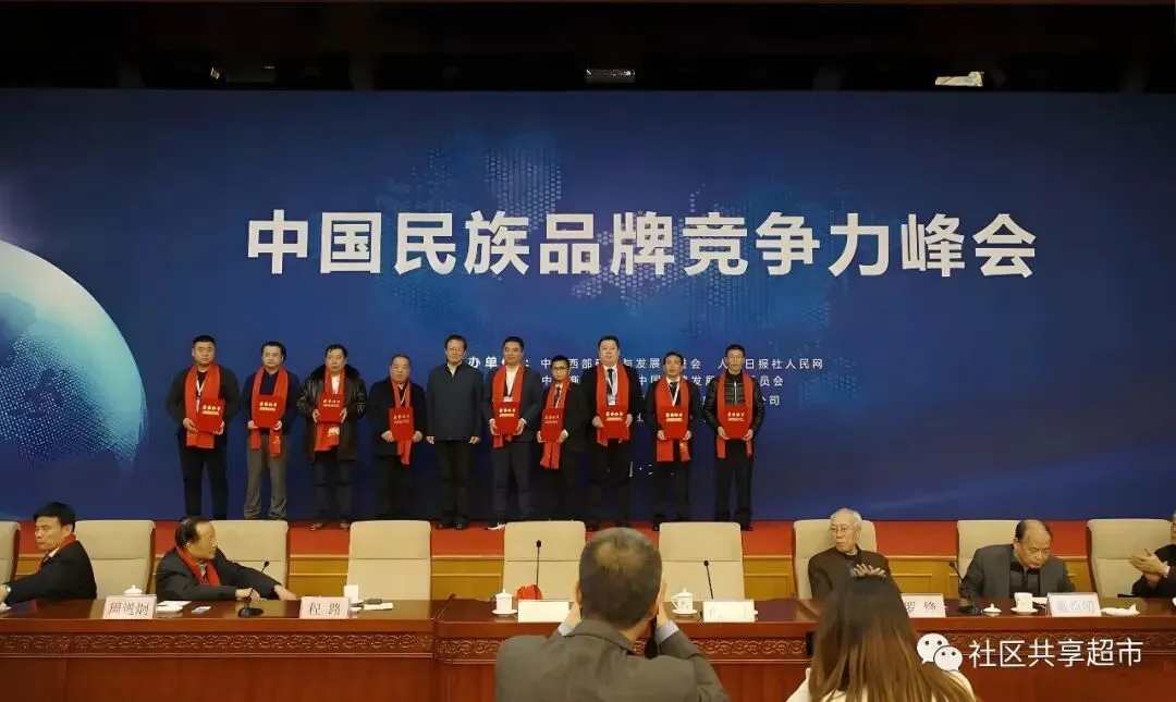 中国西促会理事长程路向栖贤山品牌创始人舒红峰(右一)颁发“中国最具投资价值民族品牌”证书,人民网等主办