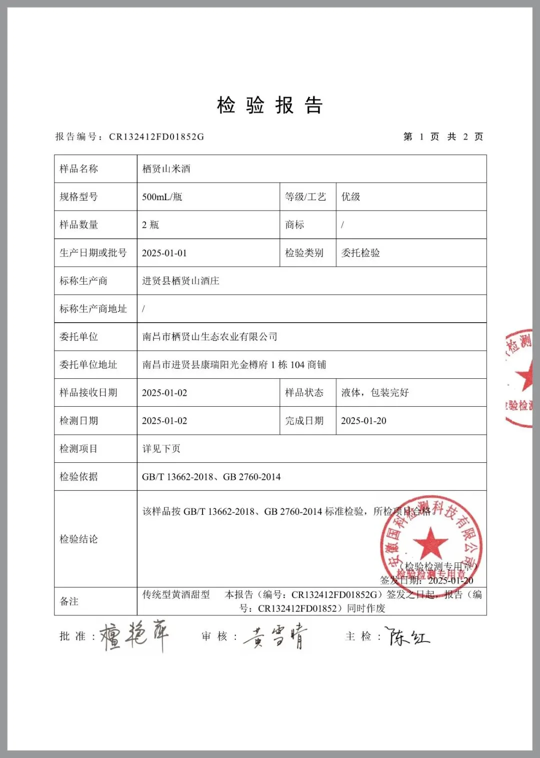 栖贤山米酒(黄酒)是由黄酒酿造中级工舒红峰(国家人社部颁发证书)同夫人范建群,以优质糯米、军山湖水、优质酒曲为原料,采用陶缸精心酿造而成,不加白酒,不精密过滤,不杀菌,保留了发酵过程中产生的各种营养成分和活性物质,原汁原味,酒香浓郁,口感甘醇绵长,营养丰富,经检测,各项指标符合GB/T13662国家标准,荣登中央电视台农业频道(CCTV-17)、央视网进行展播。