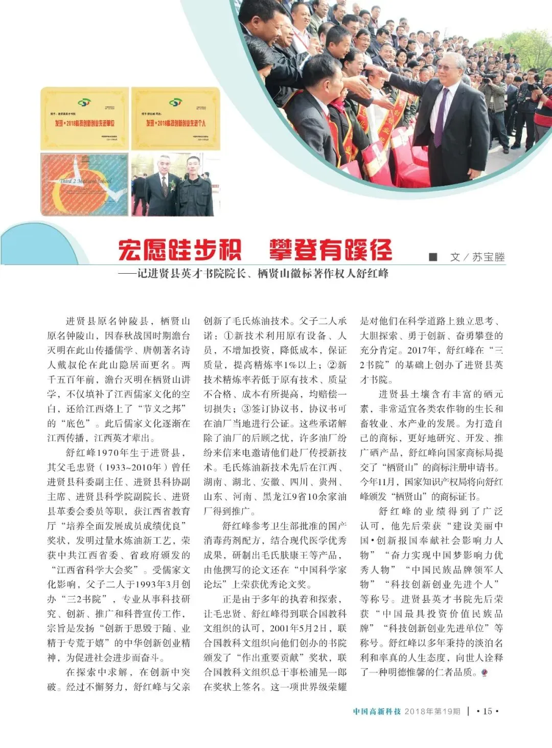 2001年,联合国教科文组织向毛忠贤同其子舒红峰创办的三2书院颁发“作出重要贡献”证书。 2017年,舒红峰在三2书院基础上创办进贤县英才书院。进贤县栖贤山是江西文脉源头,全国有很多地方叫栖贤山,为保护栖贤山品牌, 舒红峰同其子毛联国将英才书院更名为栖贤山书画院, 后又个转企,最终升级为江西栖贤山品牌管理有限公司(曾用名:南昌市栖贤山生态农业有限公司、江西栖贤山农业开发有限公司)。父子俩从字号、商标、 版权着手对栖贤山品牌进行保护,受到广泛好评。