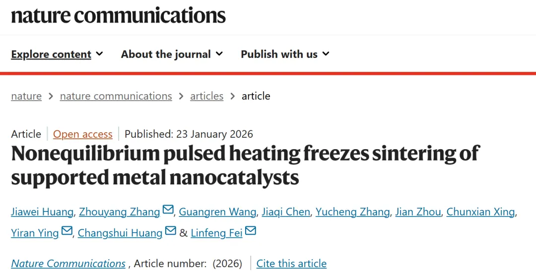 Jiawei Huang, Zhouyang Zhang*, Guangren Wang, Jiaqi Chen, Yucheng Zhang, Jian Zhou, Chunxian Xing, Yiran Ying*, Changshui Huang* & Linfeng Fei*. Nonequilibrium pulsed heating freezes sintering of supported metal nanocatalysts. Nat. Commun. (2026).