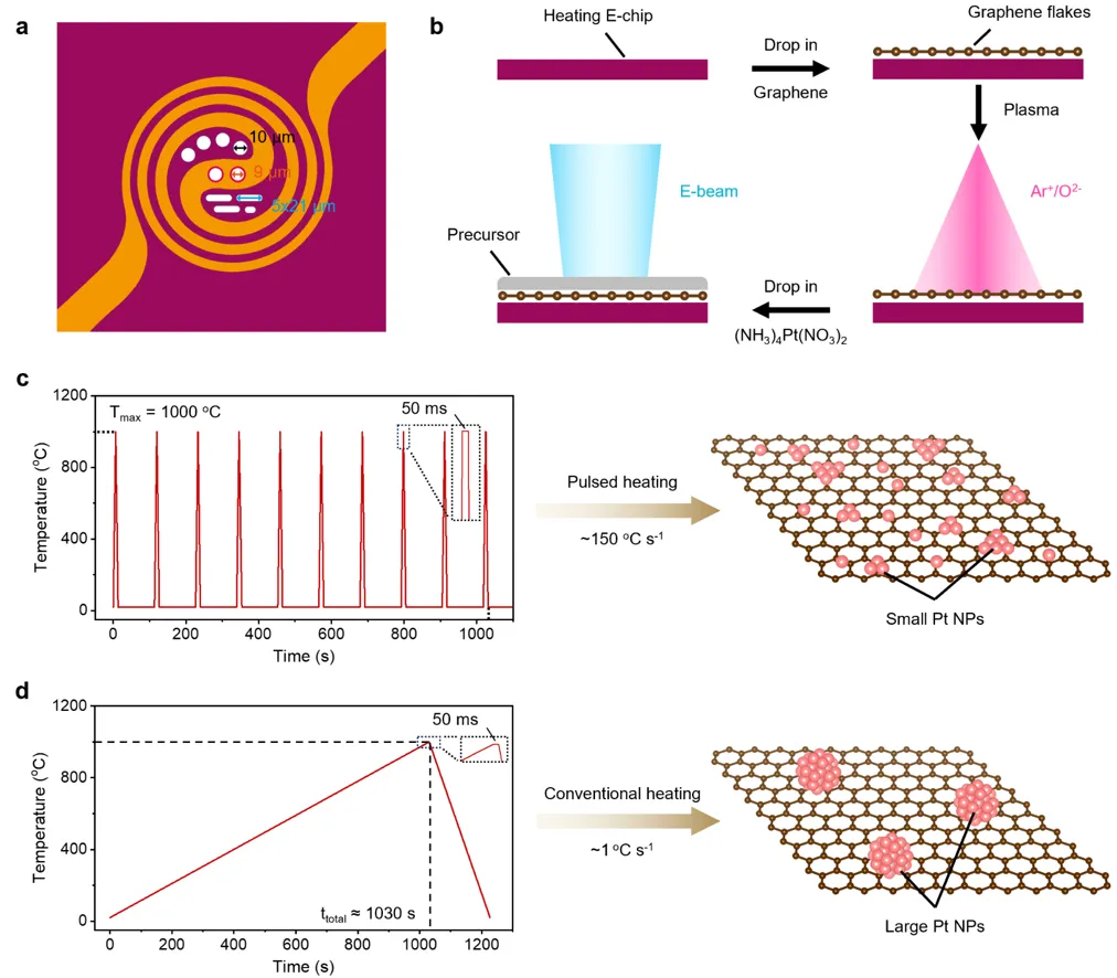 2. 加热模式对比:通过对比脉冲加热与传统加热的温度-时间曲线,直观展示了两种方法在热历程上的根本差异(图1c-d)。