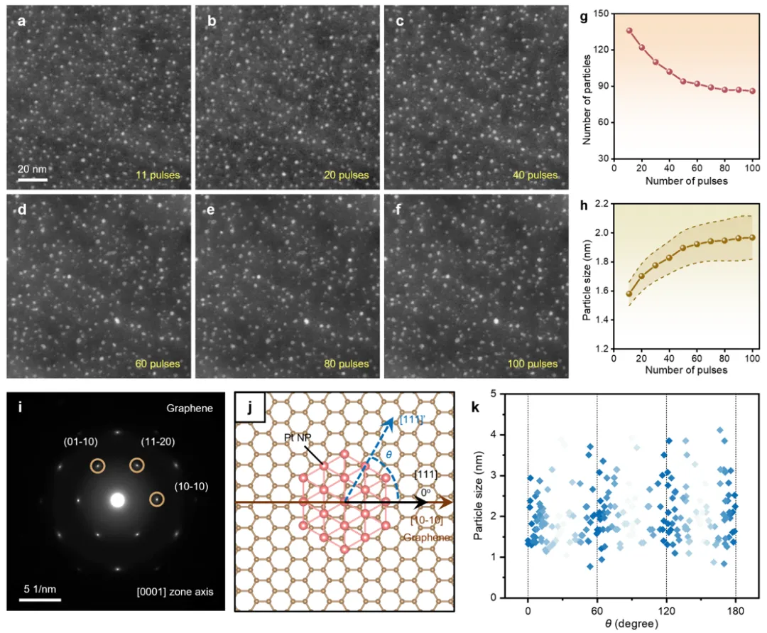 2. 金属颗粒-载体取向对齐:统计结果表明,100次脉冲后,Pt颗粒与石墨烯载体之间形成了高度的晶体学取向对齐关系,显著降低了界面能(图3i-k)。