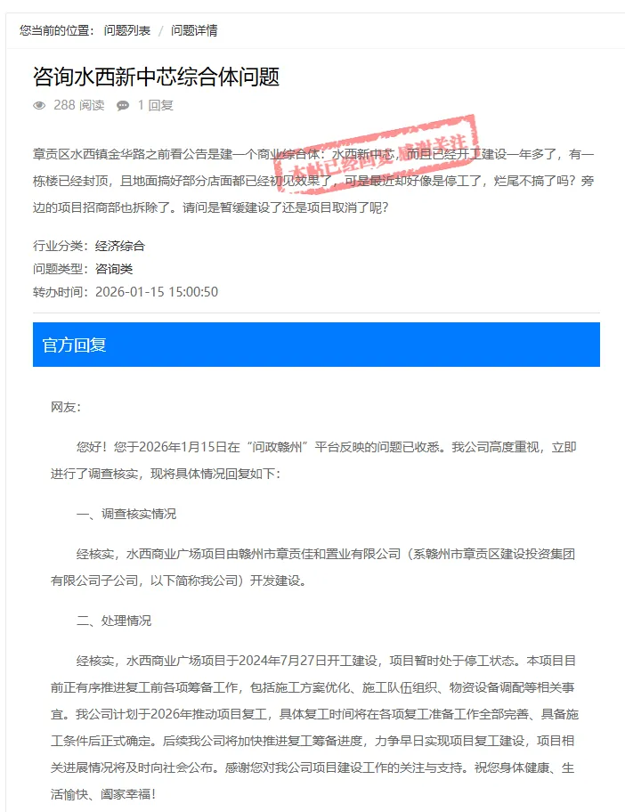 您好!您于2026年1月15日在“问政赣州”平台反映的问题已收悉。我公司高度重视,立即进行了调查核实,现将具体情况回复如下: